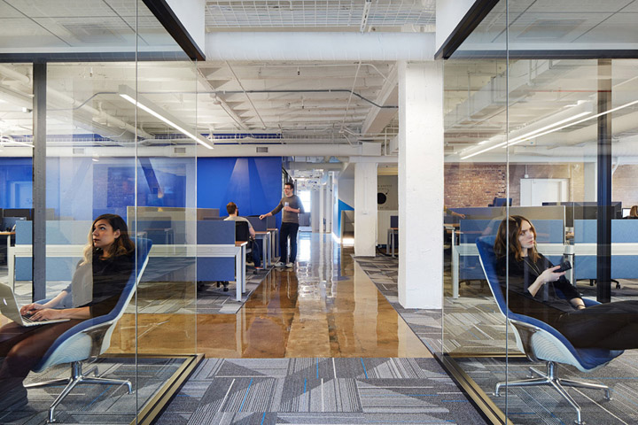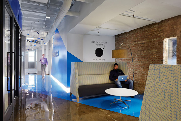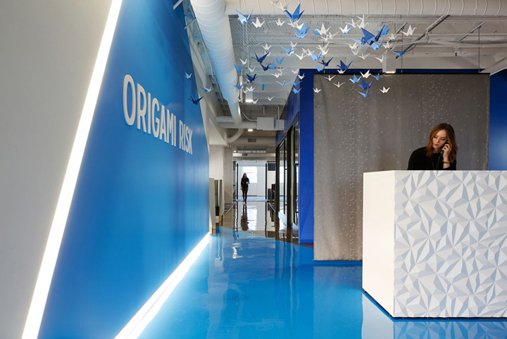 Merchandise Mart Plaza是芝加哥一处地标性的商业建筑,建于1931年,当时被称为世界上最大的办公楼,和“城中之城”。Origami 的总部办公室便位于此。Origami 的本意是折纸,公司的标识也是一只折纸般的纸鹤,设计以此为创意概念,打造了这间别具特色的办公场所。一进入公司接待区,一群蓝白相间由3D技术打印的纸鹤映入人们的眼帘。棱角分明的立体几何造型和折纸般平面构成共同交织而成接待区丰富的折纸艺术效果。