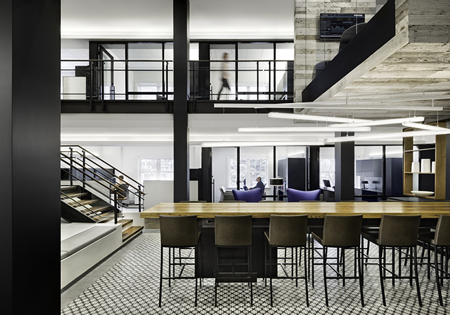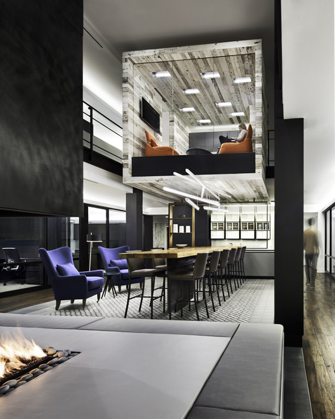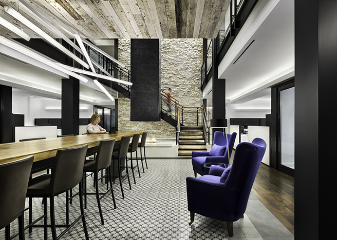 在中心的空间,作用伙伴安装一个自定义,18英尺长,3英寸厚的再生木材储藏室表电源接入,座位多达20人,鼓励合作和互动的主要公共区域。在工作站,每个员工都有个人divyde桌面充电站,商店,锁和收费的电子设备和其他贵重物品的开放的办公环境中。在大会议室,工作伙伴精心制作了一个长方形的桌子,圆的房间,中间有一缺口,即能容纳大型团体会议。