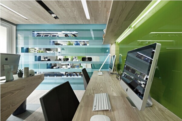 以调和色作为主调的办公室内布局有清淡素雅的特点,而以对比色为主调的办公室环境布局则显得活泼明快。不管是调和色调子还是对比色调子,都必须注意整体色调处理上的统一感,并注意适当的变化。变化如可以在大面积的调和色中配以少量的对比色,起到和谐而不平淡的效果,也可在对比色调中穿插一些中间色,或者借助材料质感,获得彼此调和得效果。在色调的具体运用上,主要是掌握好色彩的调配和色彩的配合。