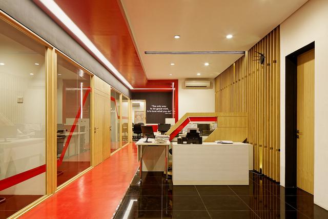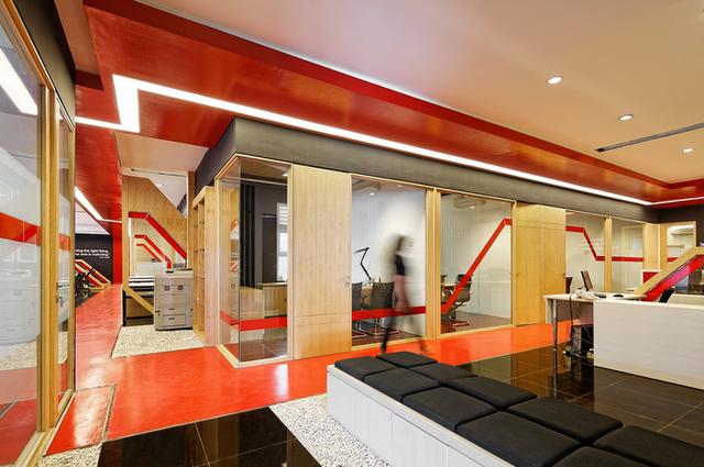 设计师在办公室设计中强调OMG的品牌标识,选择三种颜色是红色,黑色,白色的主色调。这3种颜色与木质的色调混合在垂直安装的天然胶合板上,非常引人注目。