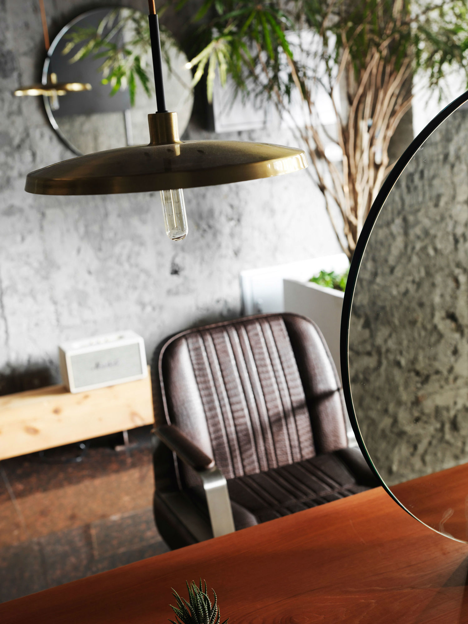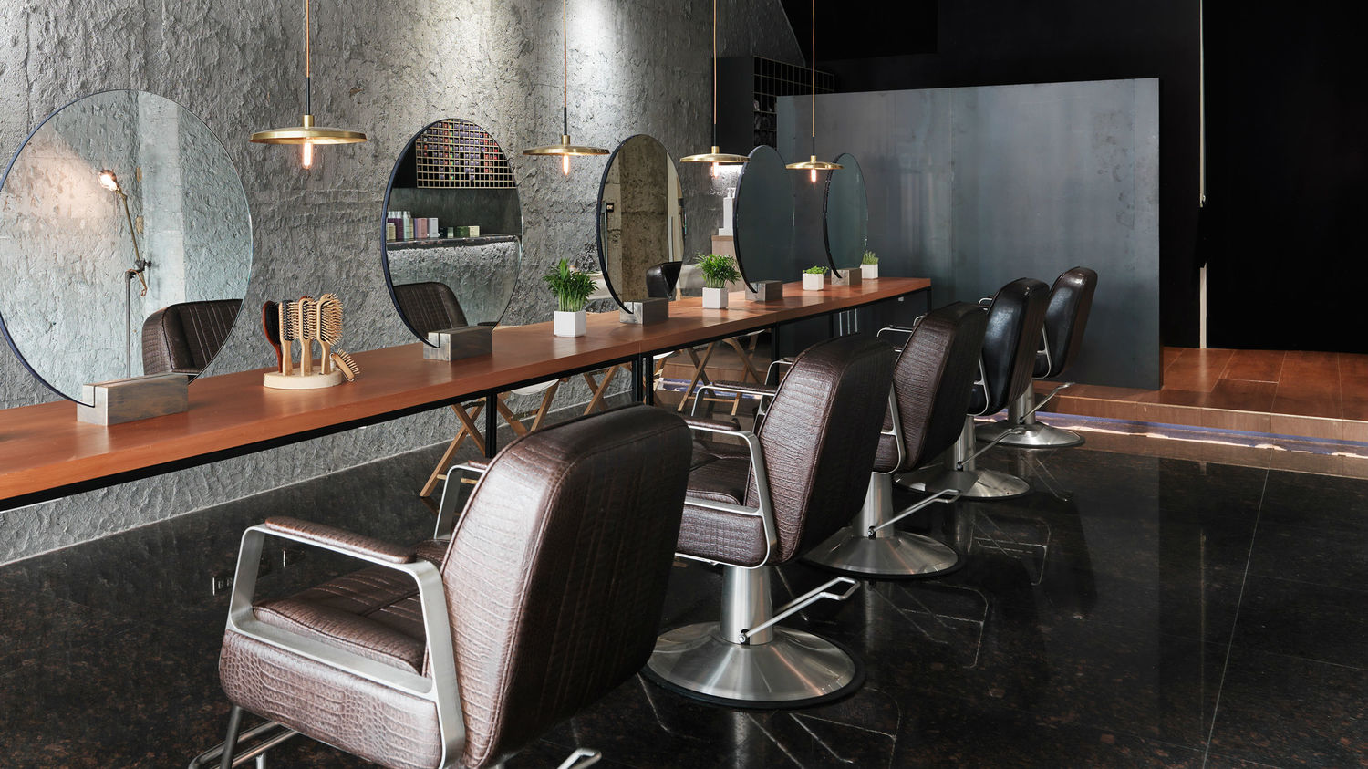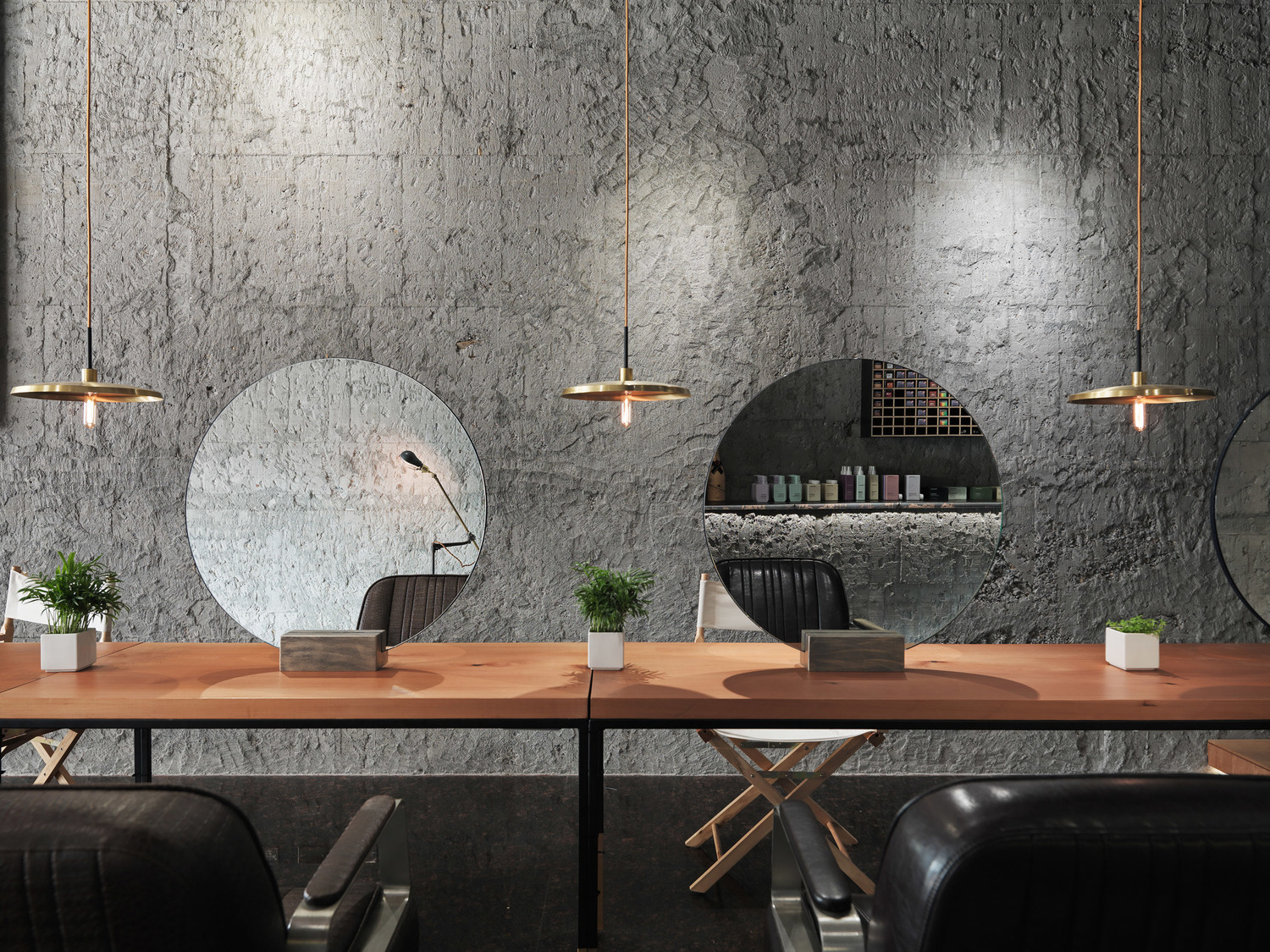 这个定制的、长的矩形工作台将面积只有45平方米的沙龙室,分割成两个区域,分别是等待区域和理发美发区域。顾客们就围绕着桌子一个接着一个坐着。圆形的镜子被放置在了木模基部上面,因而可以轻易的进行移动,这样的设计让业主可以按照需求重新安排空间。长吊灯刚好就悬挂在桌子的上面,散发出了一种柔和的光晕。墙壁上的绘画被移除了,这些墙壁是手工钻孔而成的,并被剥去了原材料表面的装饰,以创造出一种“更加亲近自然”的氛围。