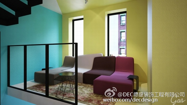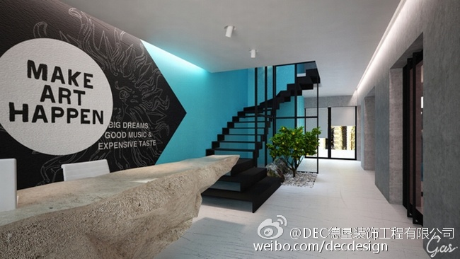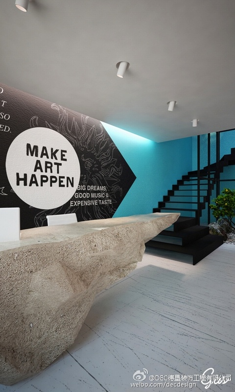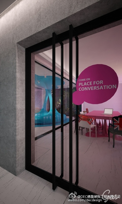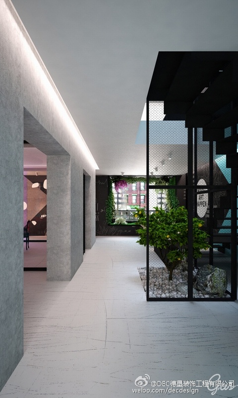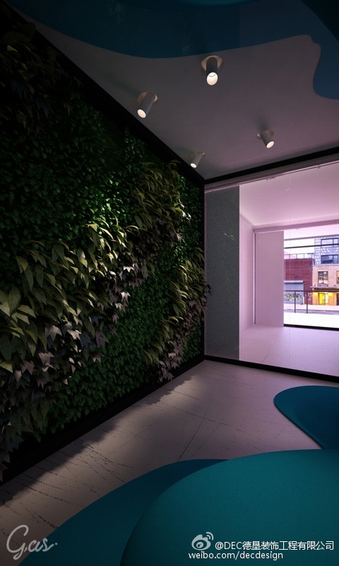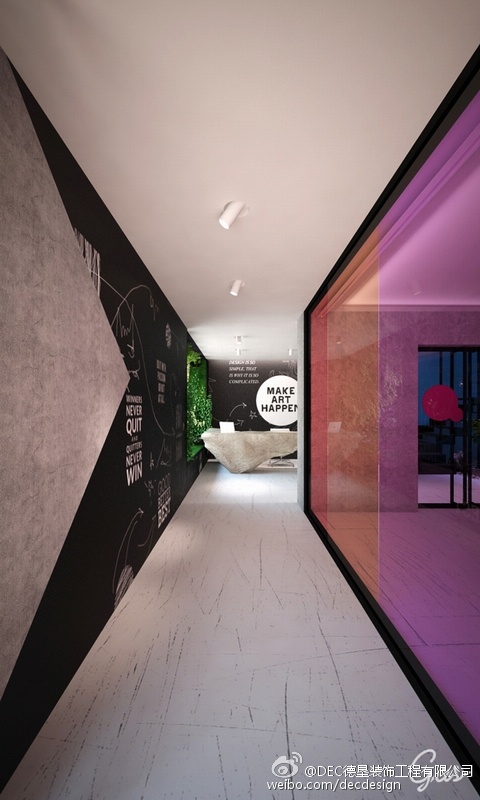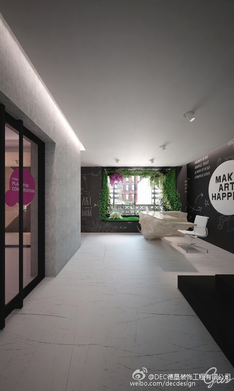 这是一家小型的广告代理公司的创意办公室,占地三层,面积不大却亮点十足,各种鲜艳颜色的搭配使这间办公空间设计充满了活力。正对着玻璃入口的是一片绿油油的植物墙,令人不禁有走进去的冲动,前台的造型也是相当前卫时尚,楼梯则选用线条简洁色彩干净的黑钢材料。