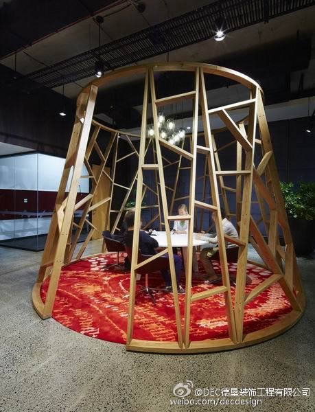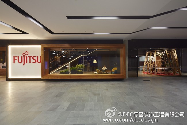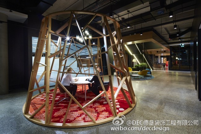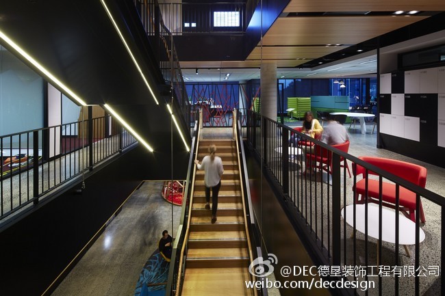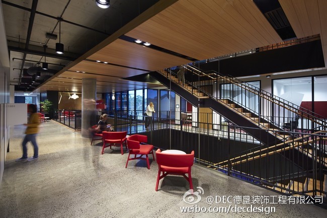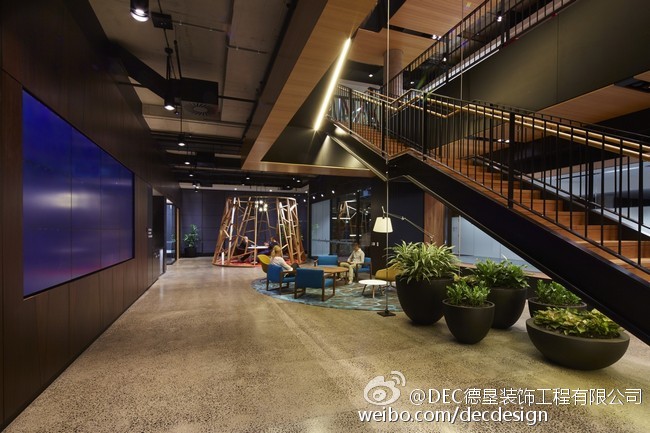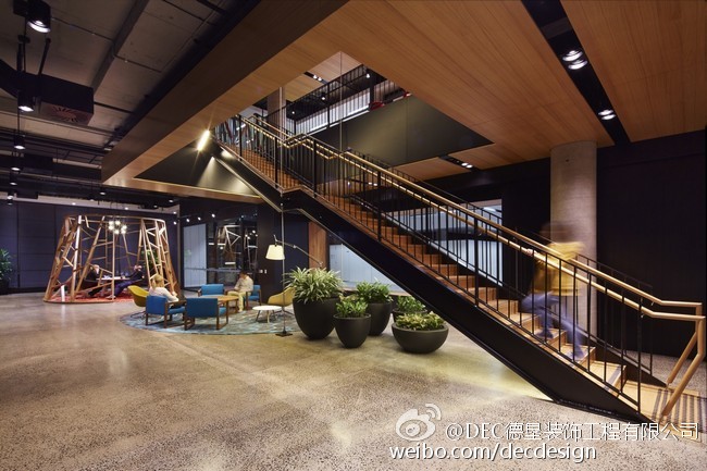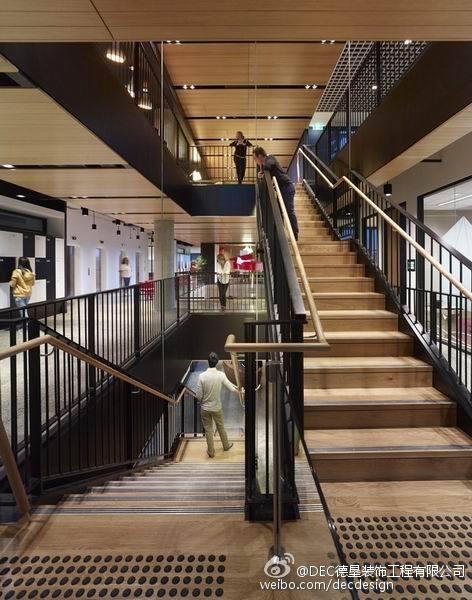 Woods Bagot设计的富士通澳大利亚办公空间总部,5层楼的空间面积约为9000平方米,业主要求空间灵活可变,不要刻板的去划分空间。Woods Bagot用一个中央楼梯,贯穿五层空间,木质元素的应用加上灯光铁件的渲染显得整个空间非常的高端、有创意。
