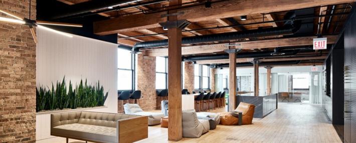 悉尼总部的设计公司为成长型的金融数据服务公司ansarada打造了一个LOFT感觉的高端办公空间,该办公室位于芝加哥。设计师想为客户提供一个动态的工作空间,其中包括各种各样的合作场所、至天花的击球练习挡网和舒适的休闲区。办公室有880平方米,位于一座老仓库的五楼,我们现在所看到的旧材料、暴露的砖块、梁柱都是建筑原始的特点,这些细节被设计师保留下来继续使用显得非常有创意。因为这栋建筑并非是文物,所以能够允许设计师大胆的设计,尽情的展示设计师的创意。