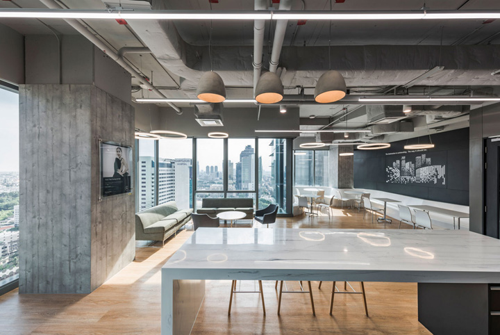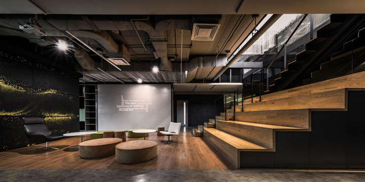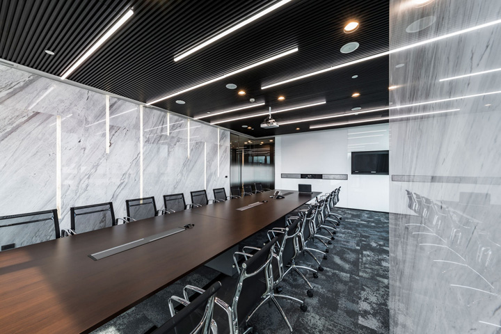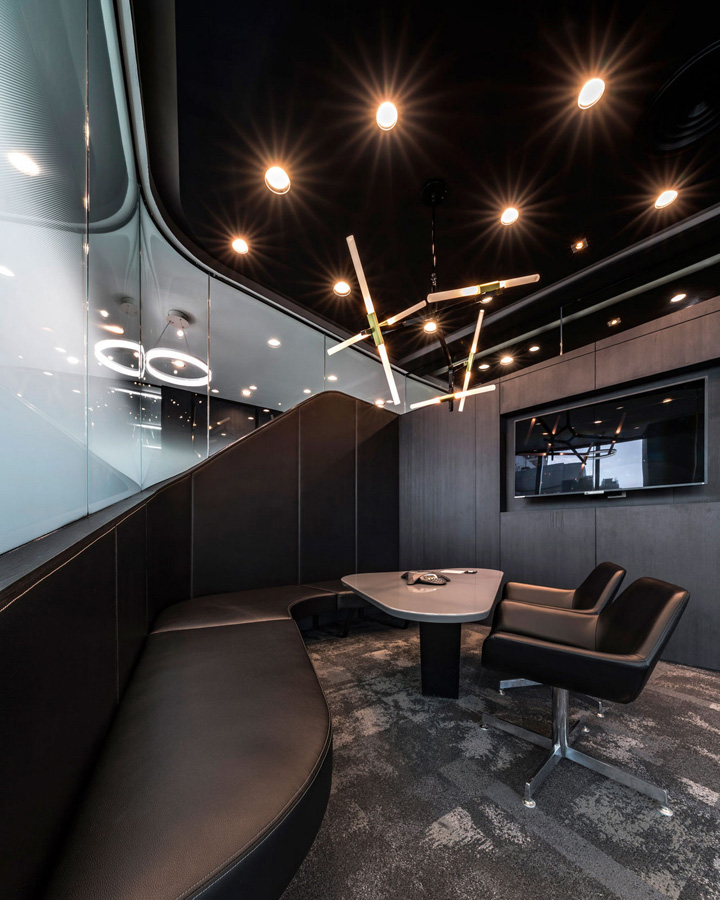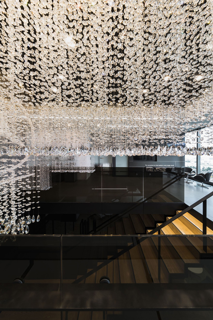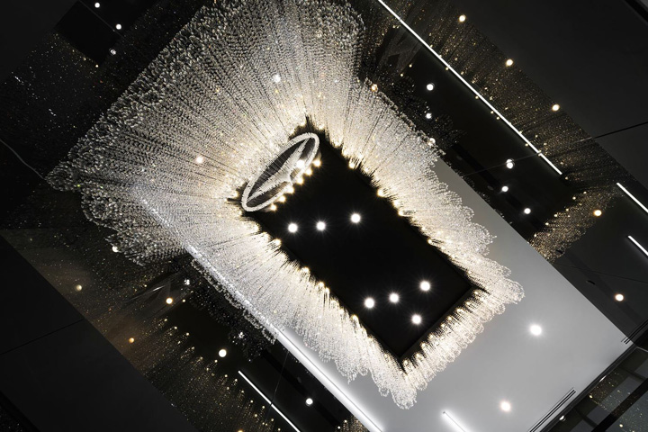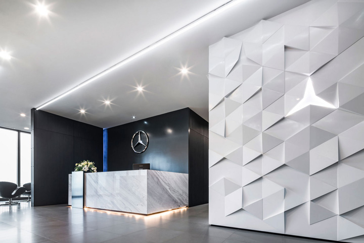 梅赛德斯-奔驰位于泰国曼谷的总部高端办公空间。由著名的pbm设计团队打造的这处办公室同样呈现出时尚型格与先锋潮流。梅赛德斯-奔驰泰国总部办公室的设计灵感,来自于其最初的创始人之一的Gottlieb Daimler(戈特利布·戴姆勒)先生。他在给他妻子寄去的一张明信片上信手画上一颗三角星标明他当时的住处,并写到:总有一天这颗吉祥之星将会照耀我毕生的工作。如今这颗三芒星已成为全球最驰名汽车品牌的象征。设计团队因此撷取三芒星的概念去塑造动态的工作空间以及相互间的关联显得很有意义。整个设计还有一大亮点是中央楼梯的上方如同星光般璀璨闪耀的水晶吊灯,不仅强化了星的概念,也为这个总部空间带来惊艳的视觉。概念的延伸还体现在室内走廊顶部的灯具设计,你会发现设计师故意运用了大小不同、方向各异的灯具嵌入顶面,其意在模仿夜空中的满天繁星,非常漂亮~