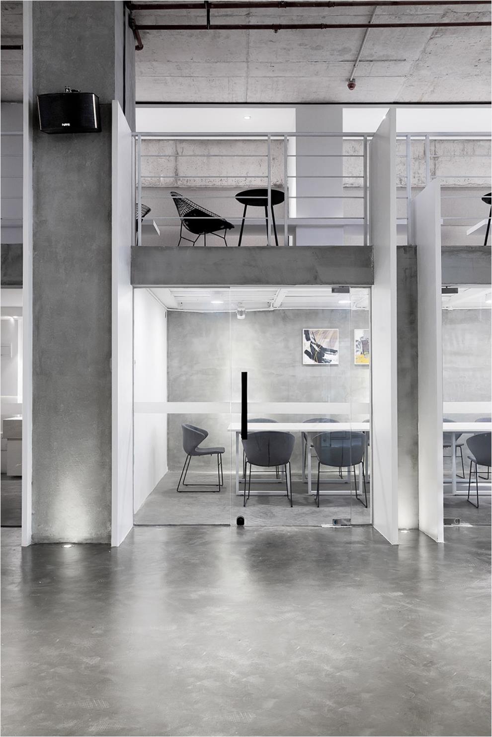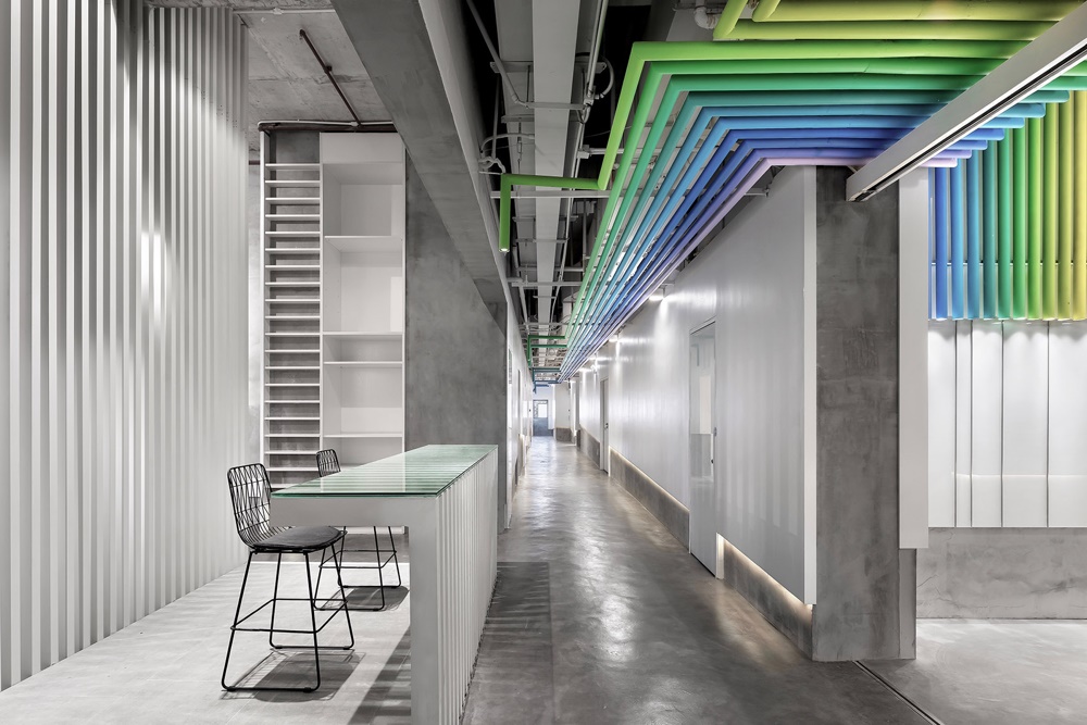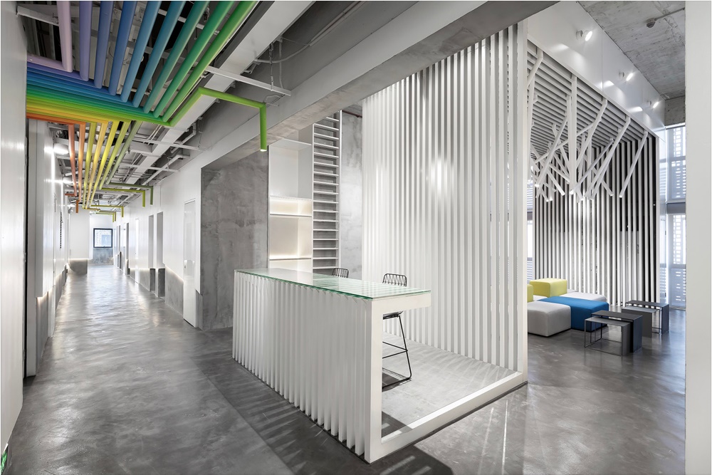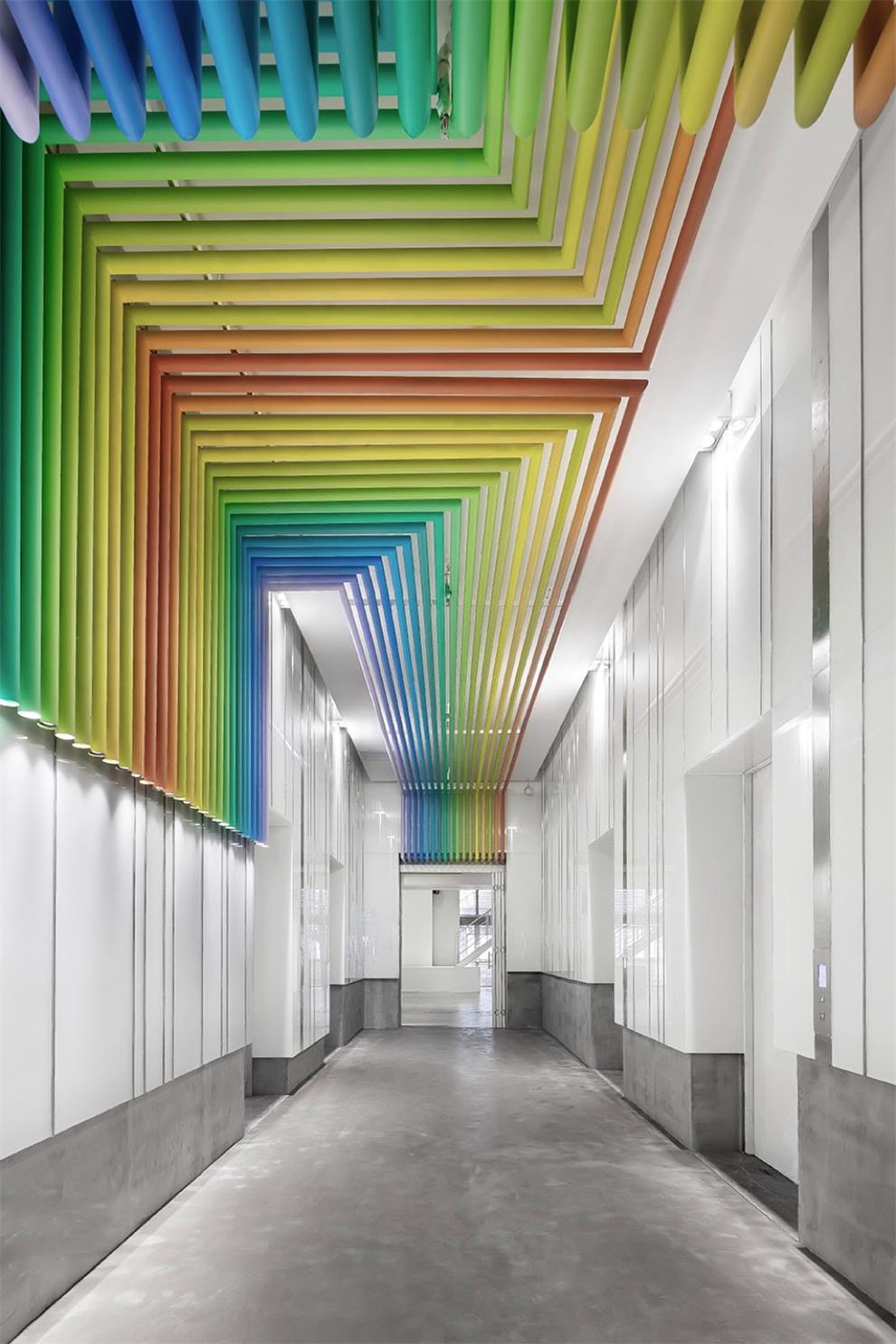 运用五颜六色的彩带,点缀无彩色的装饰,每条“彩带”都通向一个特定的区域。也是带领“到访者”最快速的到达“目的地”的导视系统。兆阳O立方位于佛山市中心,是一座高耸入云的整体建筑,是承载着城市再开发的所有标志,拥有面向年轻城市居民的高端公寓、办公空间,以及一层的大量商店店面。位于上层的是一个同名的新开放工作空间。由当地建筑事务所Black Home设计,占地1450㎡(15,608平方英尺),设计师大面积使用混凝土