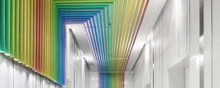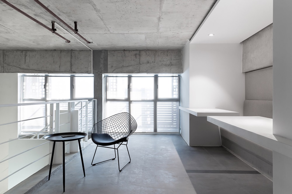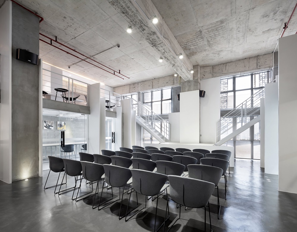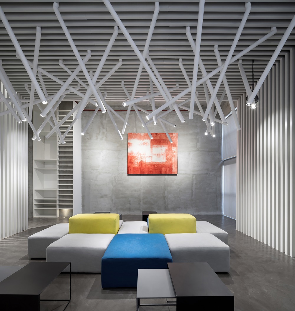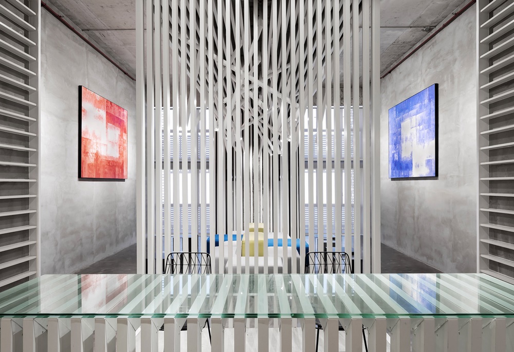 运用五颜六色的彩带,点缀无彩色的装饰,每条“彩带”都通向一个特定的区域。也是带领“到访者”最快速的到达“目的地”的导视系统。兆阳O立方位于佛山市中心,是一座高耸入云的整体建筑,是承载着城市再开发的所有标志,拥有面向年轻城市居民的高端公寓、办公空间,以及一层的大量商店店面。位于上层的是一个同名的新开放工作空间。由当地建筑事务所Black Home设计,占地1450㎡(15,608平方英尺),设计师大面积使用混凝土