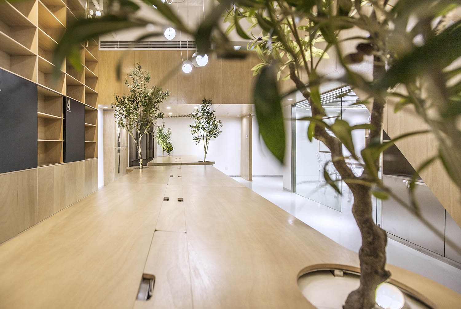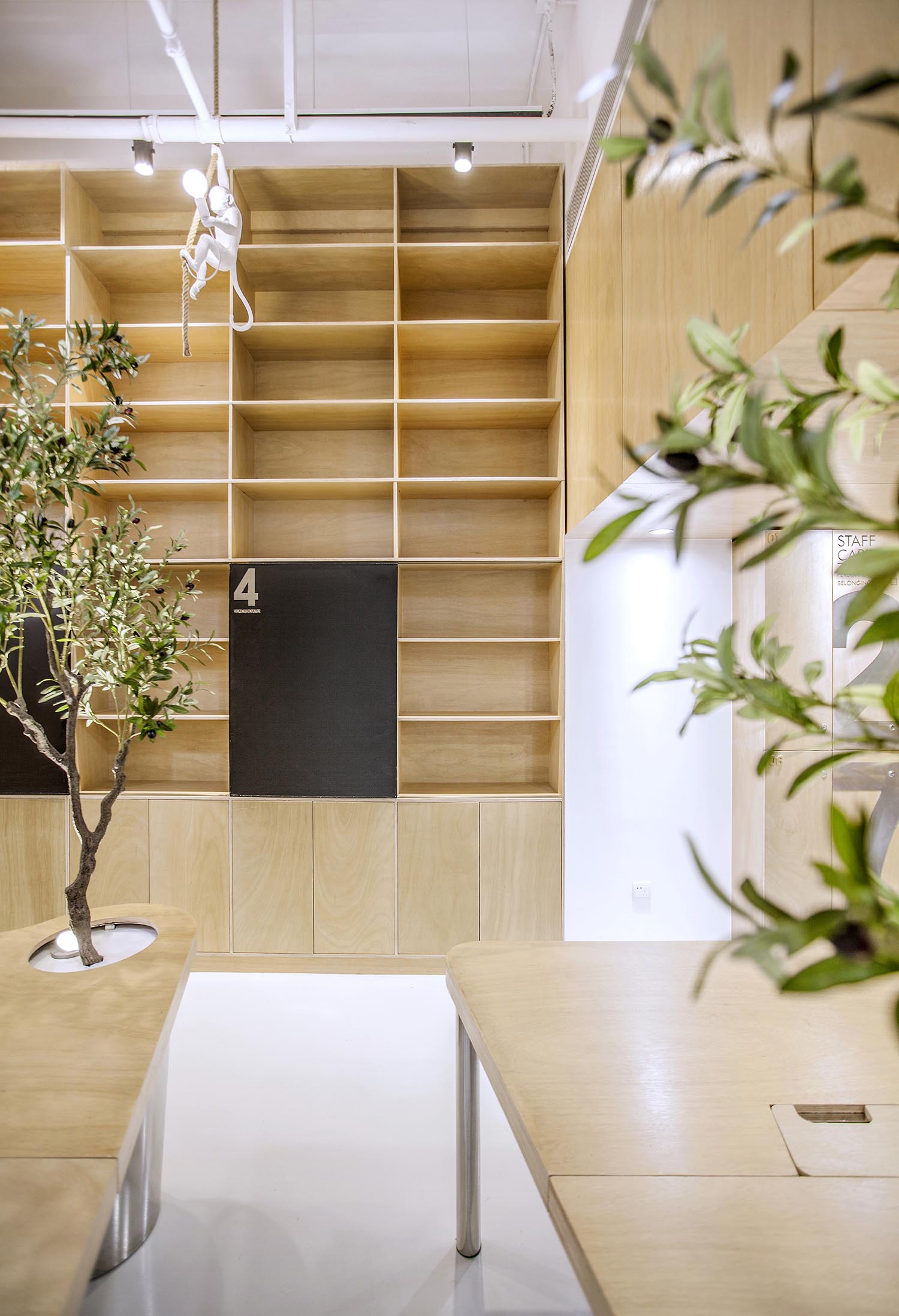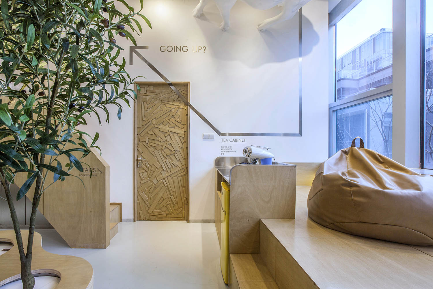 接下来分享的这个案例很有意思。这些无厘头的元素一方面均衡的软化整个空间,另一方面让我们在忙碌时候,大开脑洞.工作之余,一抬头,会心一笑,累的时候,一杯咖啡,坐在窗边放飞一下自我。本案例来自堂晤设计,整个设计方案是壹 头牛、贰 只猴子、叁 个豆袋、肆 块黑板、伍 组柜子、陆 个树池。集齐六个条件,完成一个工作室。空间用了大量温暖的木色,并组成木质的空间体快,这些体快以整个白色空间为背景,进行功能与空间节奏上的构筑。一起欣赏下
