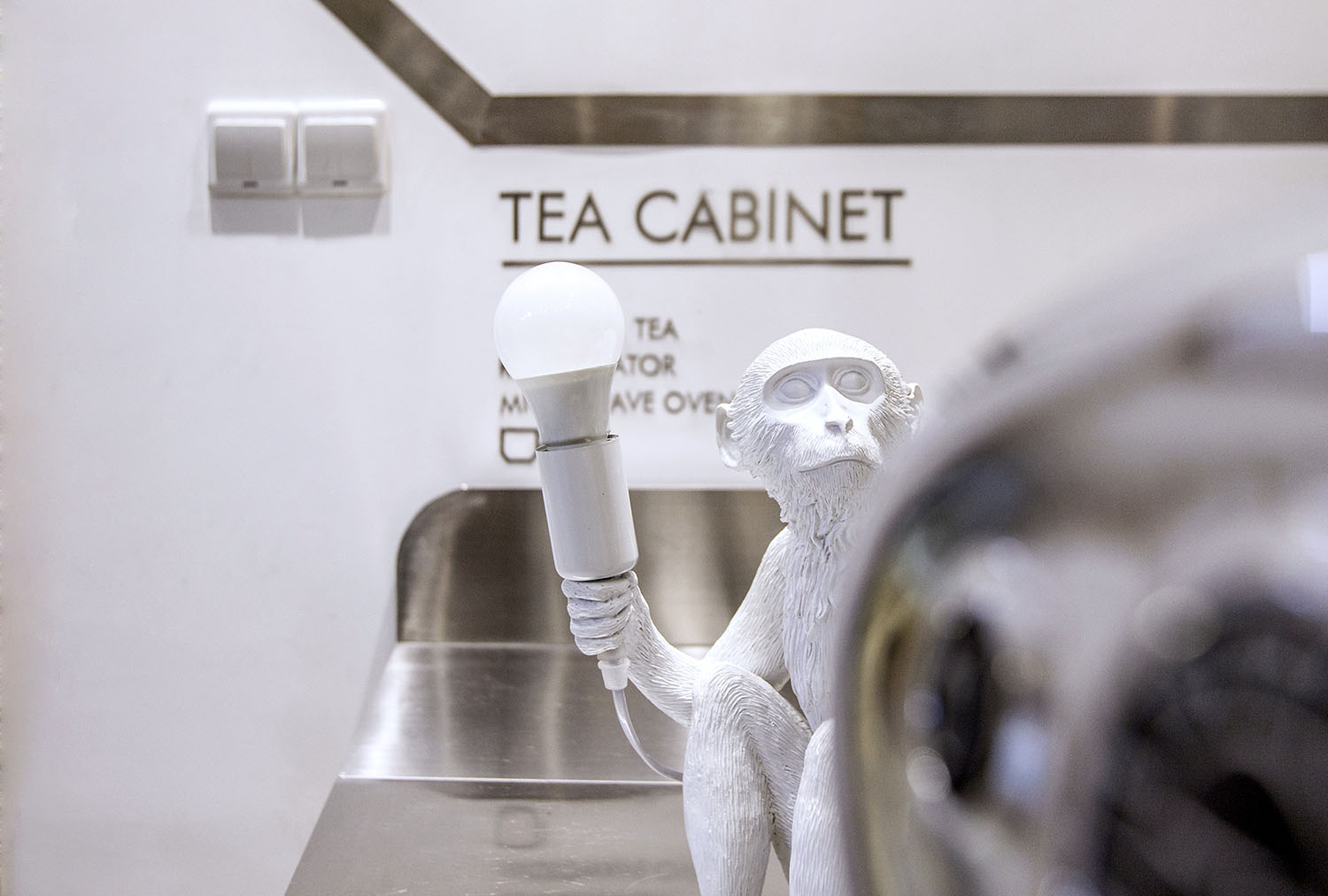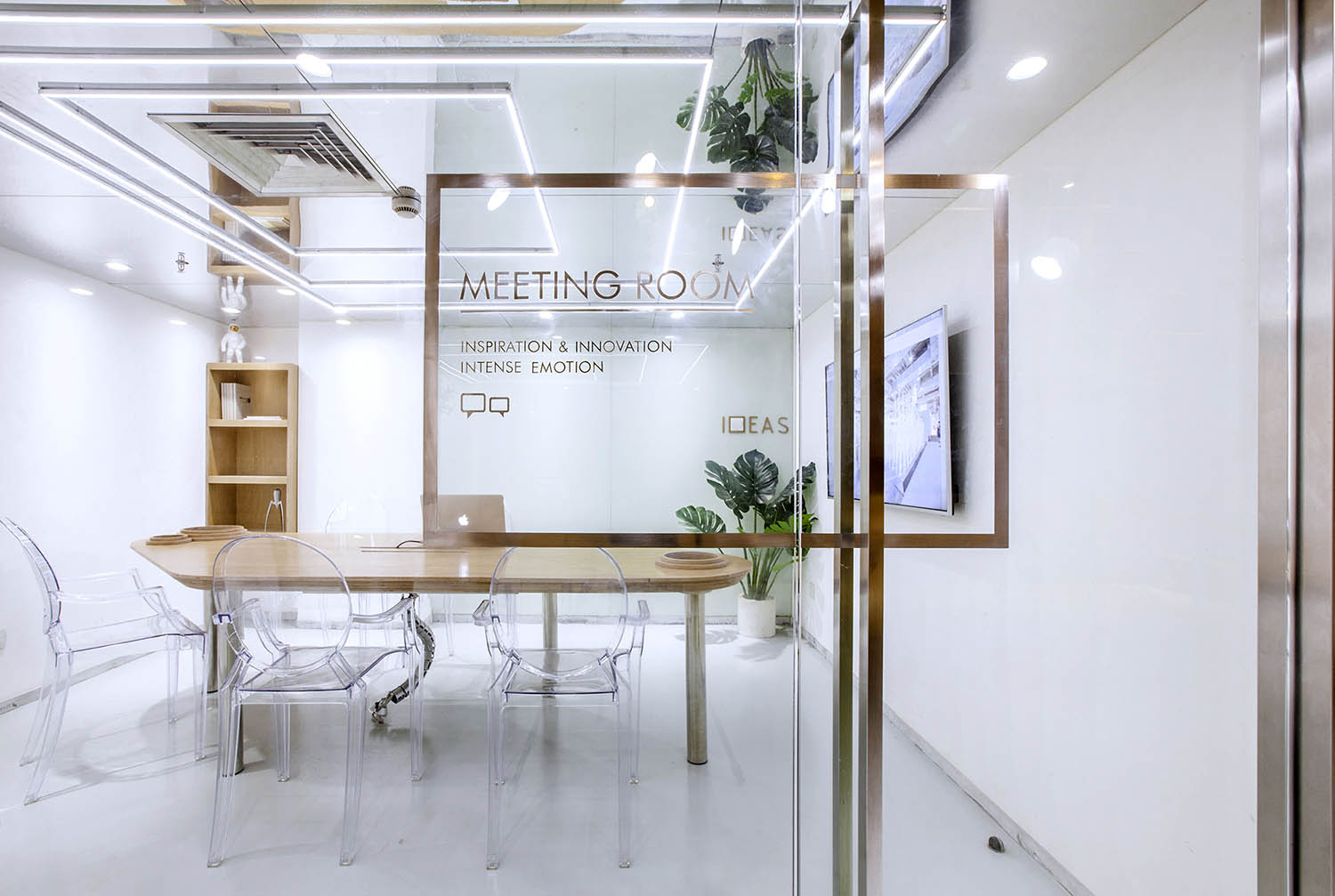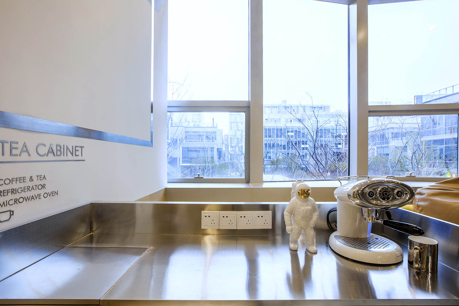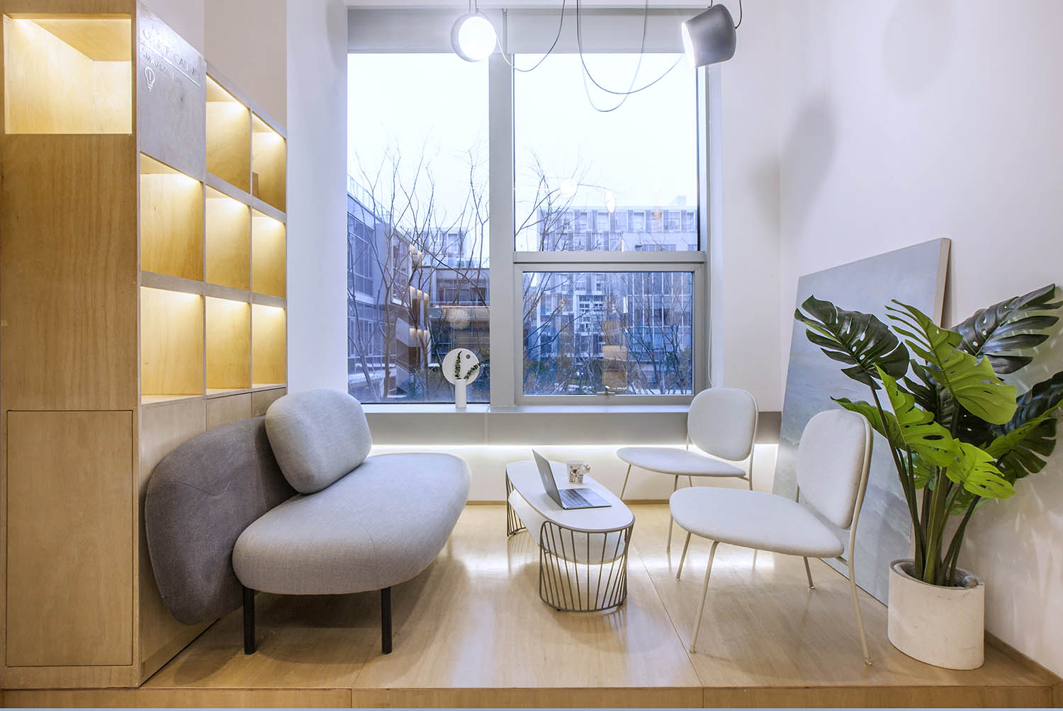 接下来分享的这个案例很有意思。这些无厘头的元素一方面均衡的软化整个空间,另一方面让我们在忙碌时候,大开脑洞.工作之余,一抬头,会心一笑,累的时候,一杯咖啡,坐在窗边放飞一下自我。本案例来自堂晤设计,整个设计方案是壹 头牛、贰 只猴子、叁 个豆袋、肆 块黑板、伍 组柜子、陆 个树池。集齐六个条件,完成一个工作室。空间用了大量温暖的木色,并组成木质的空间体快,这些体快以整个白色空间为背景,进行功能与空间节奏上的构筑。一起欣赏下