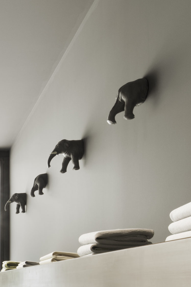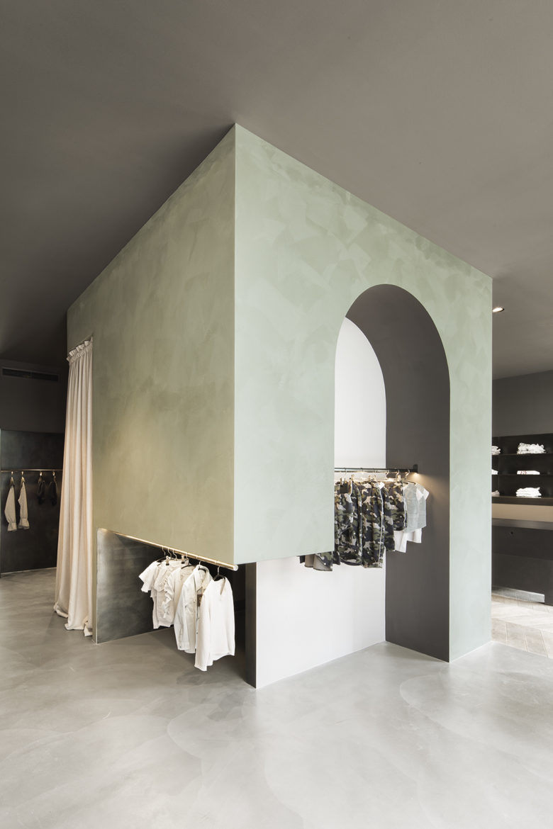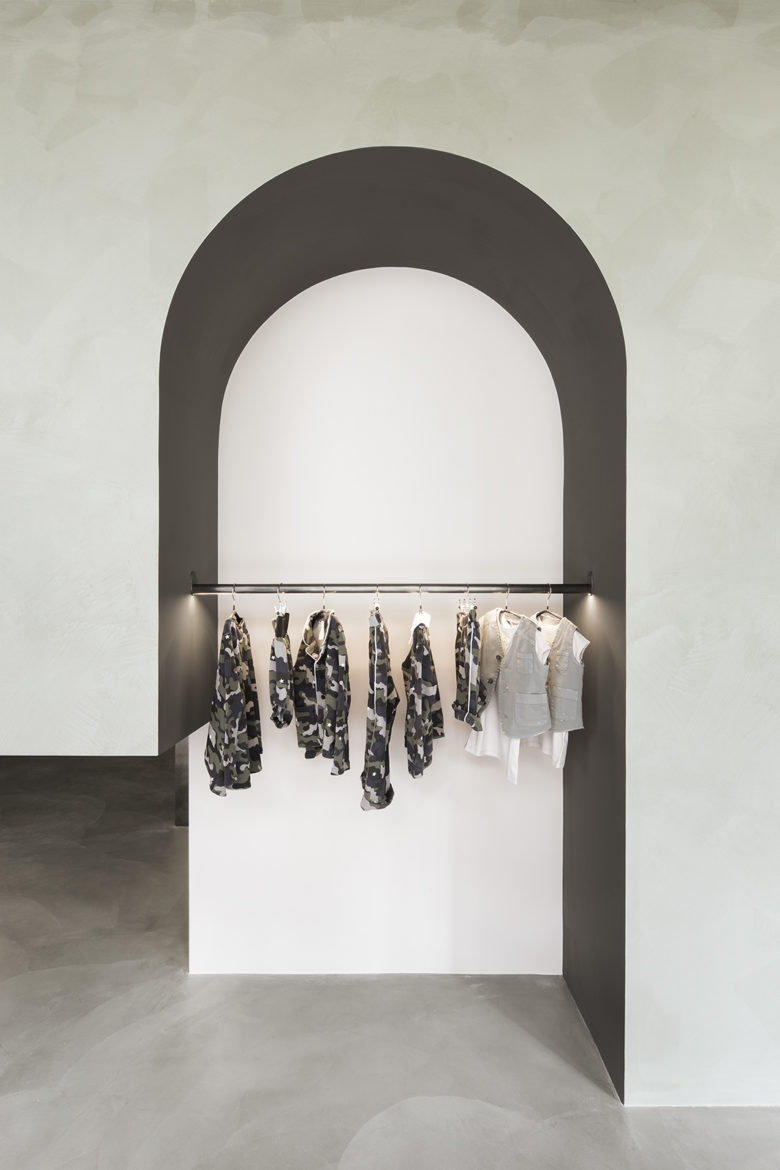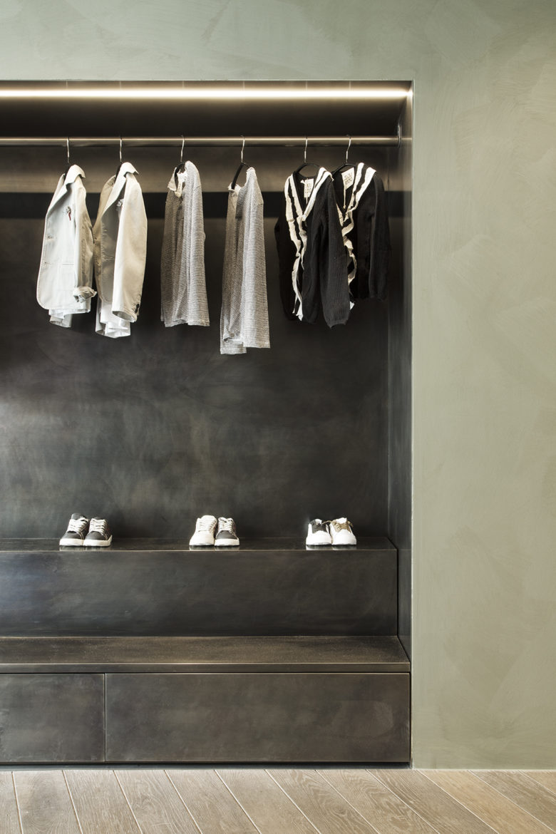 由MUUS Architects设计的Dou Dou儿童服装店位于米兰马瑞提那。收银台后面的DouDou品牌由黄铜制成。收银机用金属板覆盖,而操作面采用中密度纤维板。空间中大孩子服装的衣架,是运用抛光铁制的管状型材制成的。一盏灯嵌在衣服悬挂的侧面。在衣架前,一个金属楼梯在“children’s house”内建起。楼梯旁边是一间更衣室,是从房子本身的体量中挖出来的,藏在亚麻窗帘后面。原店铺的橡木地板得到了维护,而在新的扩建部分,地板是采用树脂混凝土表面。看似简单,但是细看有很多有意思的元素。一起欣赏下