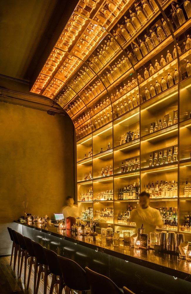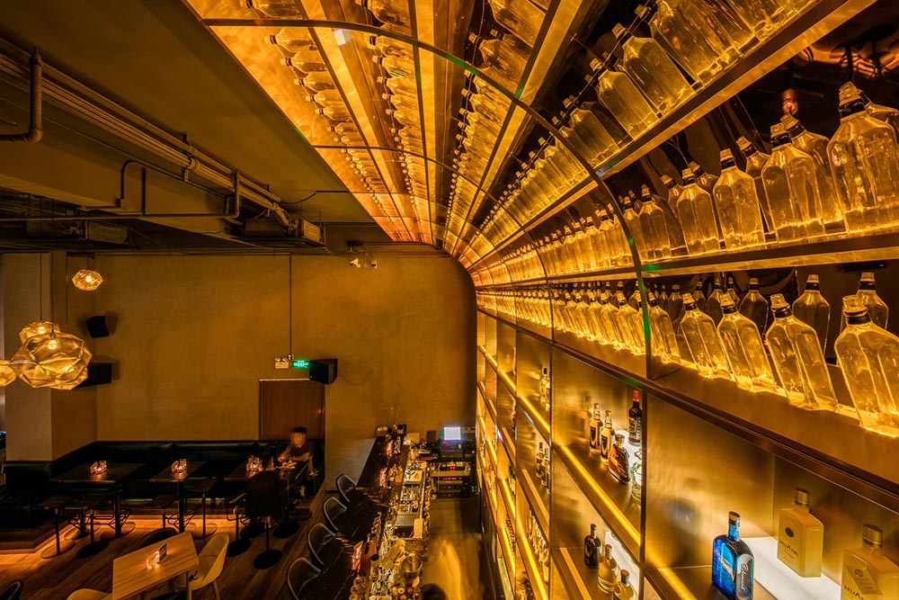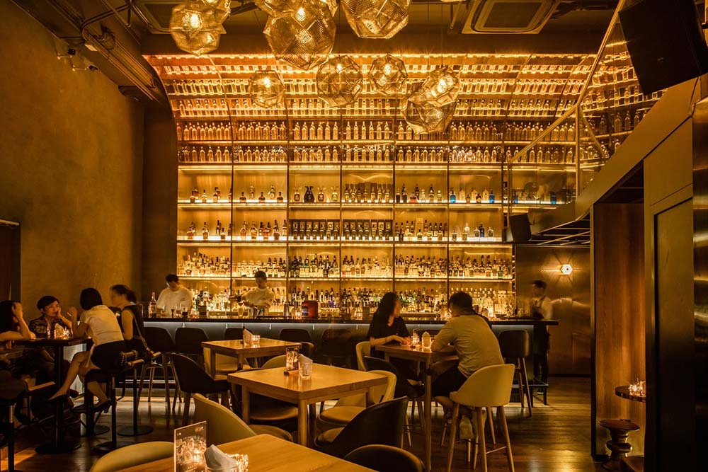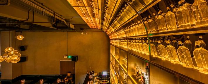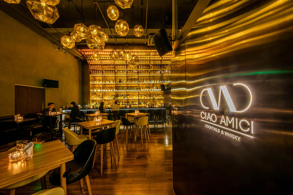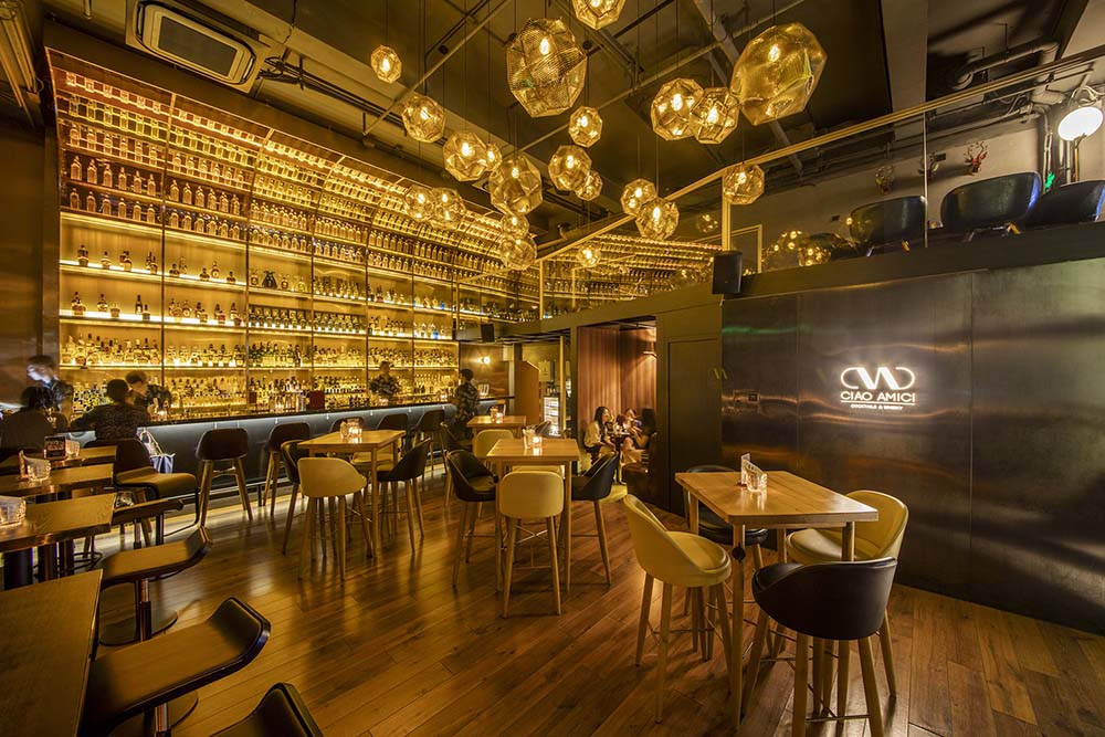 今天推荐的案例是由合吉空间艺术规划执行,项目位于中国深圳南山区软件产业基地的一座独栋建筑物。店名取自意大利文的招呼语“Ciao amici”。整体设计以金色为主调。柔和的金色光芒流动在五个主要区域:空间立面,吧台高墙,夹层座位区,VIP包间以及化妆间。完整地呈现设计主题的延伸,以及达到各个区域之间的美感和谐。欣赏下图