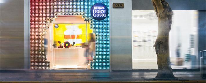今天分享的是雀巢公司在中国上海的第一家概念店Dolce Gusto,由SODA建筑师事务所设计完成,店的外立面由3000个胶囊组成,可以通过可编程的LED灯改变颜色,LED灯位于1000个白色胶囊内,使每个胶囊像一个像素。每组15个胶囊被包装在一个透明的盒子里,当所有的盒子放在一起时,它们就会形成一个3米×3米的多媒体屏幕,呈现出一幕幕有趣的低分辨率动态图像。墙壁上覆盖着彩色的胶囊盒,创造出彩虹般的外观,并展示了各种可用的选择。