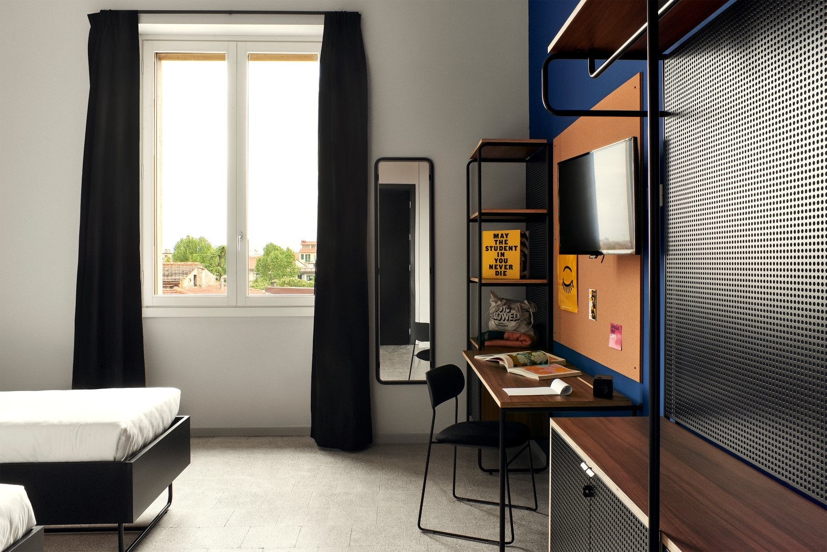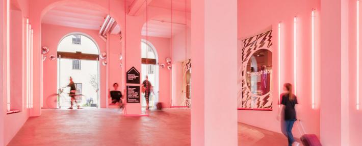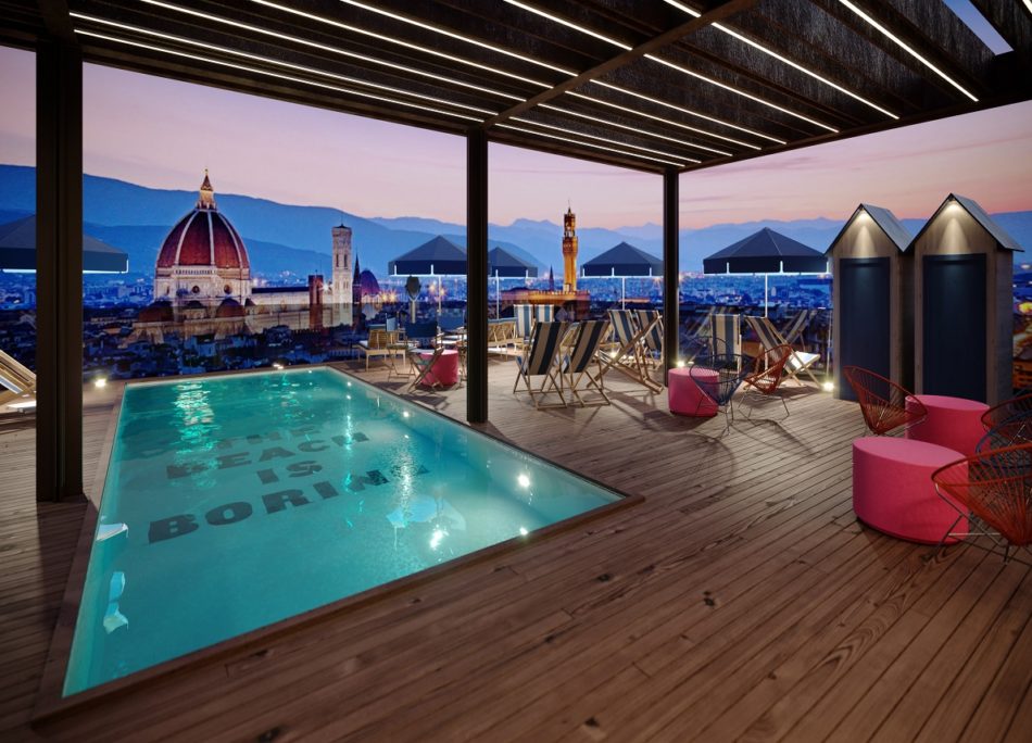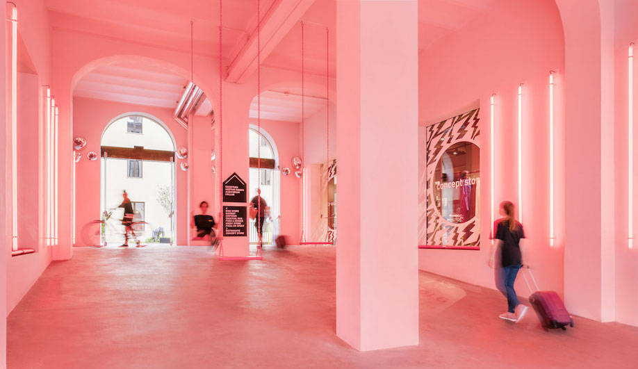 今天分享的是学生酒店的空间设计,在托斯卡纳首府佛罗伦萨的心脏附近,Rizoma Architetture为学生酒店(Student Hotel)品牌设计了一个色彩鲜明、活泼有趣的室内空间。在街上,淡淡的粉红色光芒标志着佛罗伦萨学生酒店首次确立其存在的地方。走进新酒店的拱廊,霓虹灯的色彩更加强烈。通过邻近的庭院,装饰图形引导人们来到前台,大胆的纯色、对角图案和霓虹灯照明元素相互作用,创造出强烈的空间感。这家拥有393间客房的酒店由博洛尼亚的Rizoma Architetture设计,酒店将旅游住宿与共享工作空间,公共生活环境和精品零售相结合。一系列令人印象深刻的设施也有助于营造一种社交的客户体验。除了设备齐全的健身房和展示屋顶游泳池外,还有各种灵活配置的空间,可容纳从休闲聚会到正式讲座等各种活动。酒店为学生和商务人士提供服务,提供充足的场所,可以打开笔记本电脑或啤酒。一起欣赏