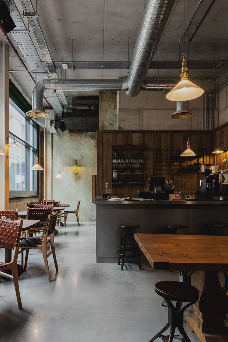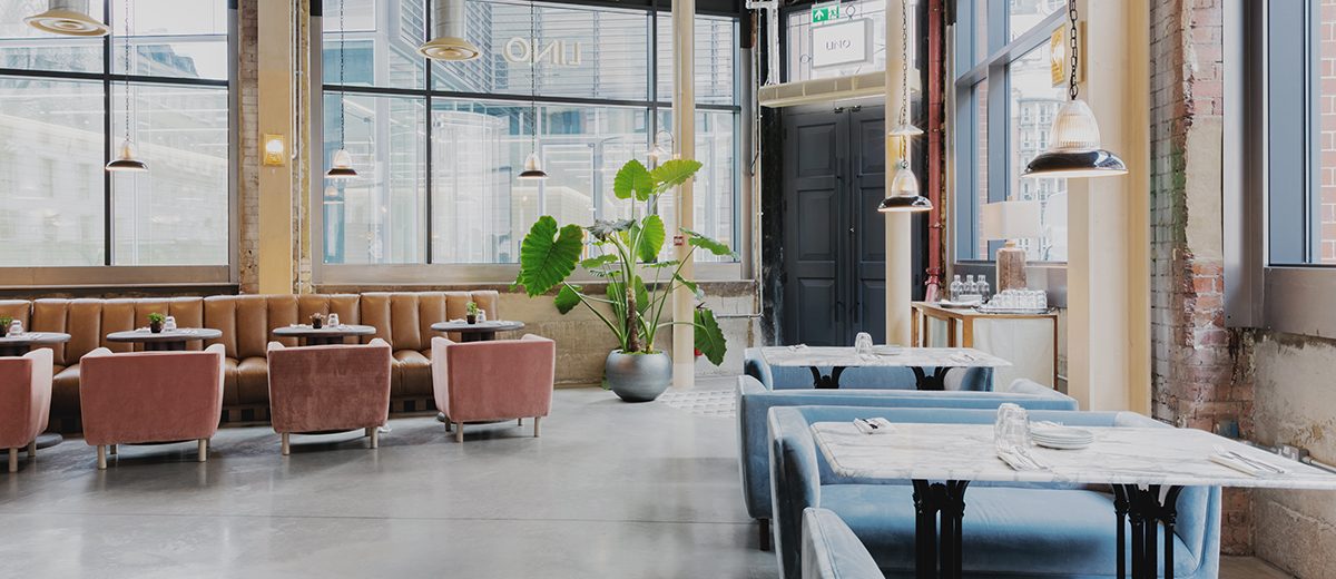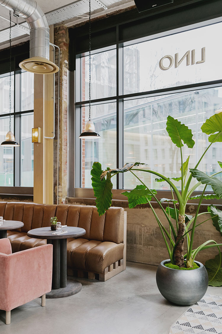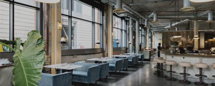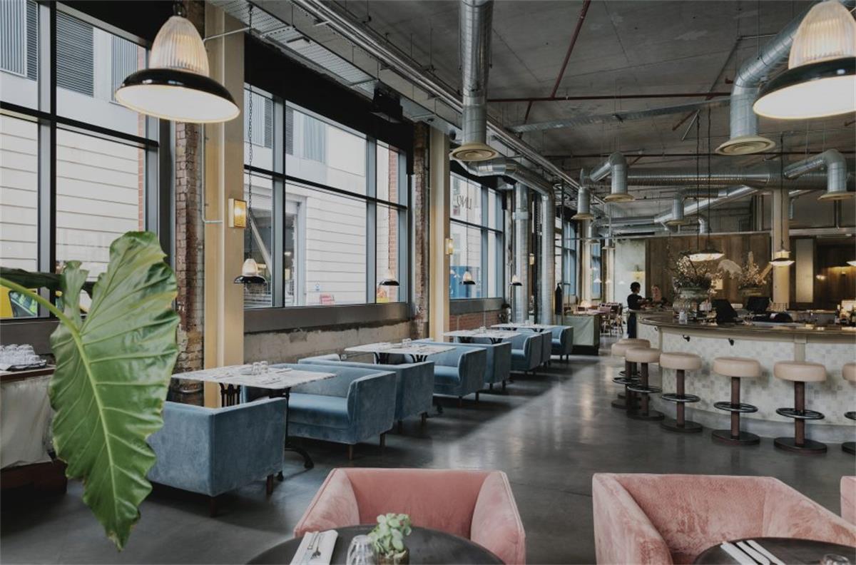 今天分享的是一个改造的案例,位于伦敦Square Mile的一家新的全天餐厅酒吧,坐落在一个废弃的加工油毡和地毯仓库中,这里充满了工业遗产。由红砖改造的仓库外部覆盖着上世纪50年代的棕色釉面瓷砖。最初的工厂窗户和12英尺高的工厂门也被保留下来,他们是设计工业美学中的核心。从回收的灯具到可持续材料的使用,餐厅为Lino带来了一种环保的理念。室内有现代的光线、通风的仓库风格和受到斯堪的纳维亚的影响。该空间用裸露的钢梁、抛光的混凝土地板和通风设备剥离回原来的仓库风格,以三叶草形状的酒吧为特色,是该空间的焦点。雕刻打蜡的郁金香木条形大理石顶部和瓷砖外部设有带桃色和灰色色调的纽扣式皮革酒吧凳,作为餐厅座位的中心,位于空间的四周。定制家具设计贯穿整个空间,柔软的蓝色天鹅绒软垫沙发和法式餐厅风格的大理石桌子,凹槽棕褐色皮革长椅和木制吧台。空间的特色是酒吧在一个质朴的木制空间中,混凝土墙旁设有大型木桌、学校椅和金属凳,而三角形咖啡桌和丹麦风格的编织皮革座椅则排列在大工厂的窗户旁。精致的不透明玻璃、黄铜吊灯和回收的工业壁灯装饰了咖啡馆空间,作为私人用餐区。欣赏下图