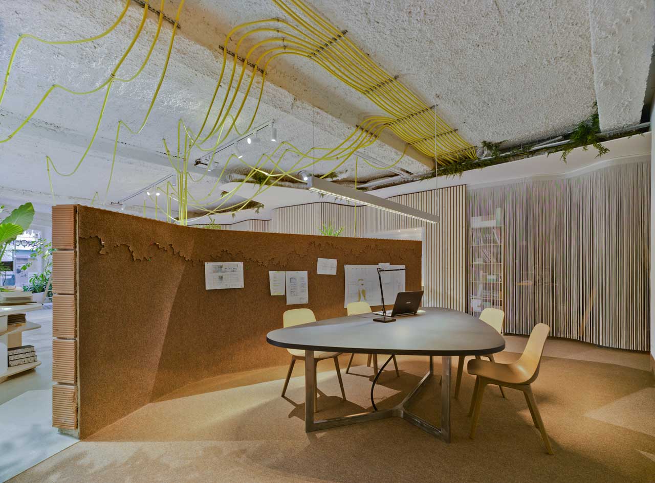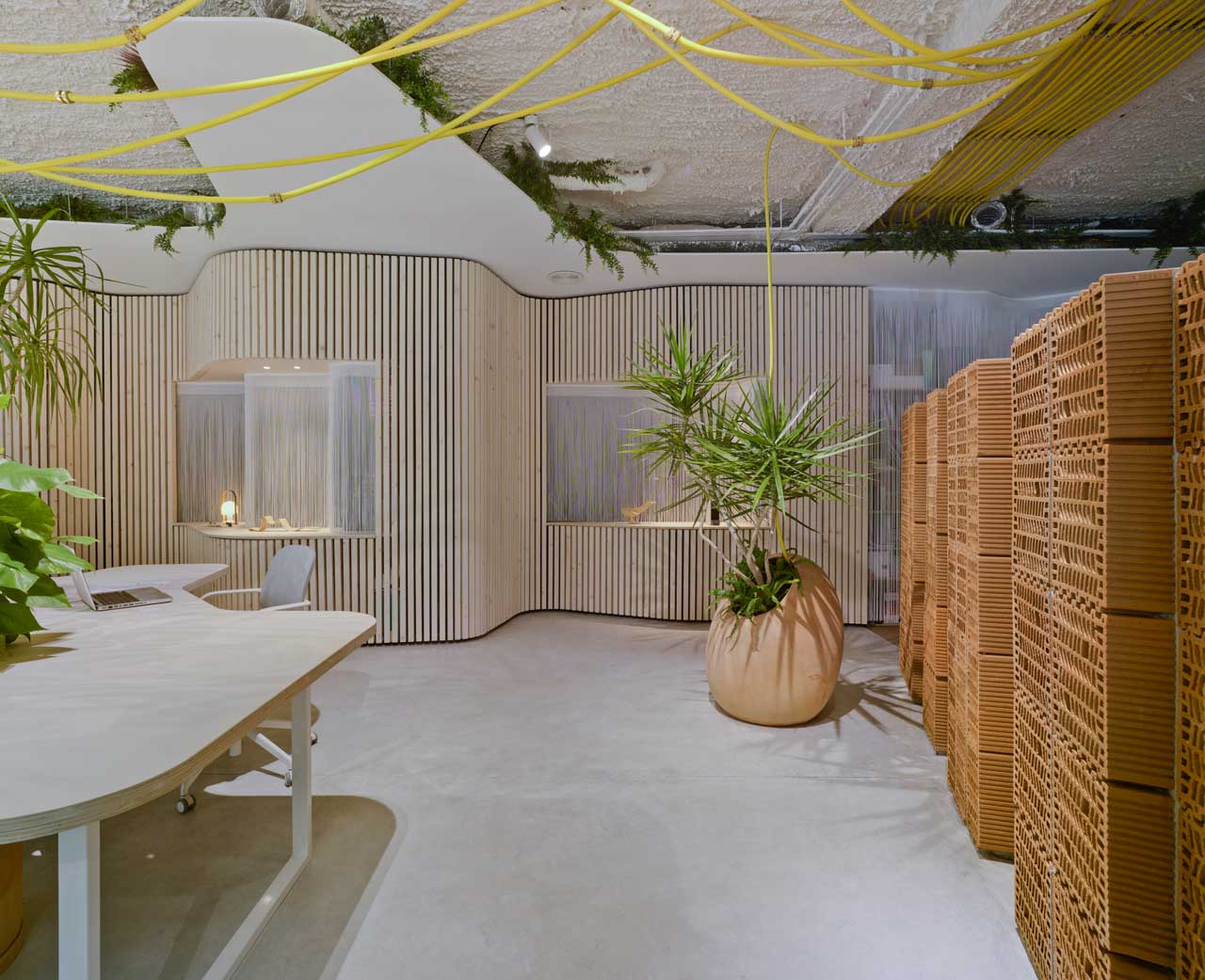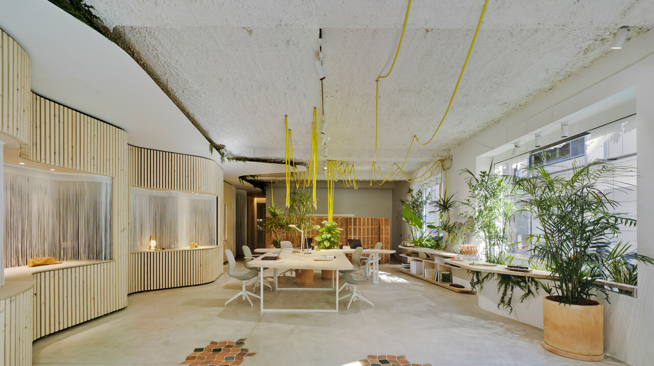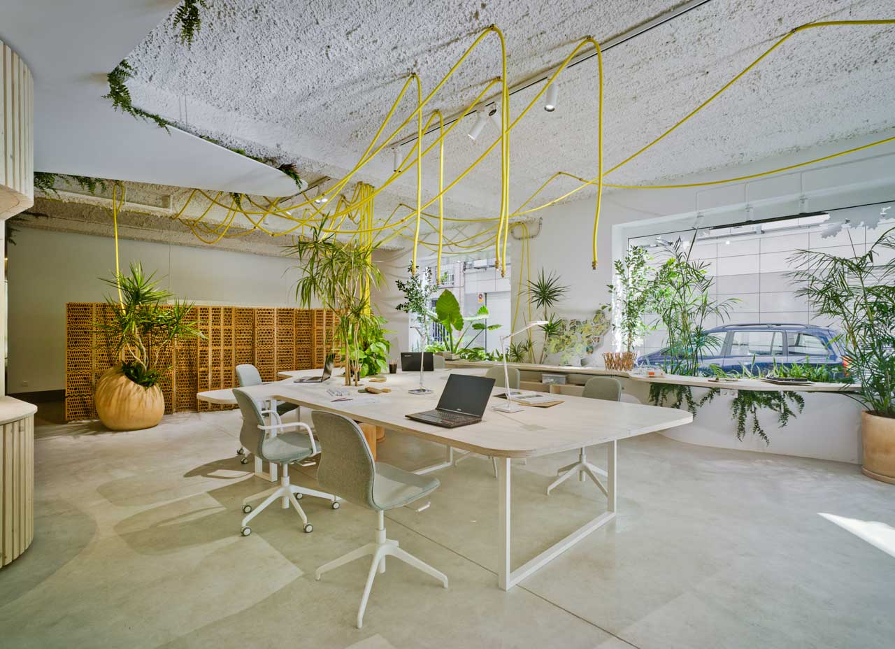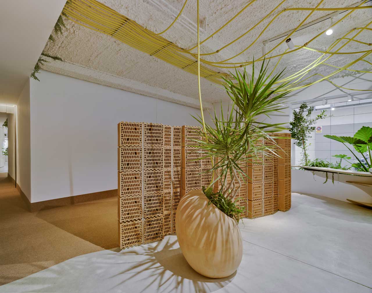 今天分享的是班牙WOHA新工作室,Antonio Maciá 设计的WOHA是他们位于西班牙埃尔切的新工作室。其概念是设计一个类似“室内庭院”的空间,其中包括一系列元素:花盆,工作台,装置,储藏室,陶瓷墙和卫生间。在窗户前,一系列的花盆围绕着四周排列,作为勾勒“天井”的一种方式,同时可以让植物吸收阳光。随着时间的推移,这些植物会像在户外一样生长并改变办公室的外观。垂直的松条形成了一个波浪状的墙壁,后面有一个白色的帘子,用来掩盖存储区域。天花板上挂着一系列黄色的水管,为植物提供水源。一面陶瓷墙为办公室后面的会议室提供了隐私。地毯有助于吸收声音,因此空间不需要关闭。一起欣赏