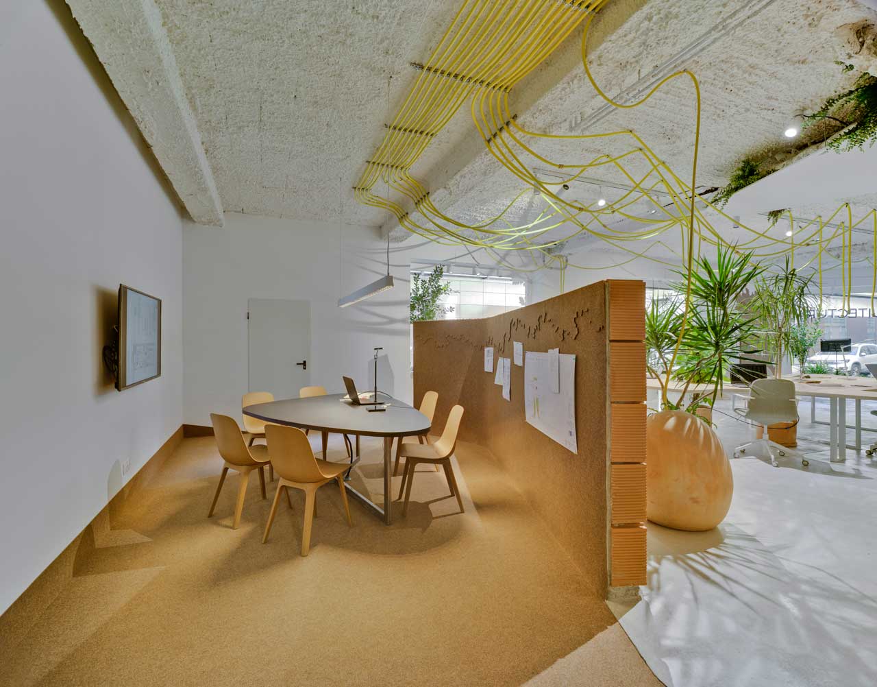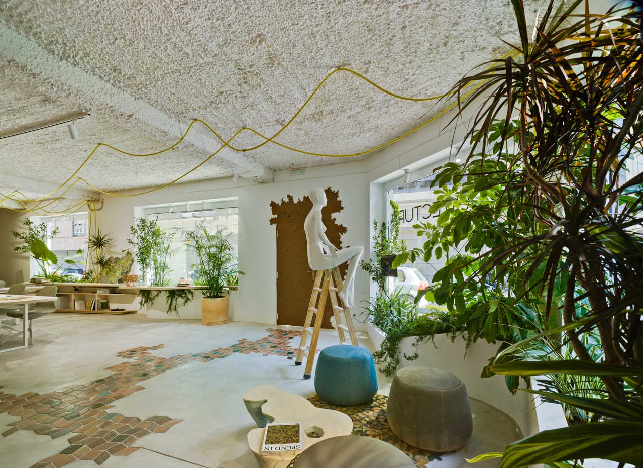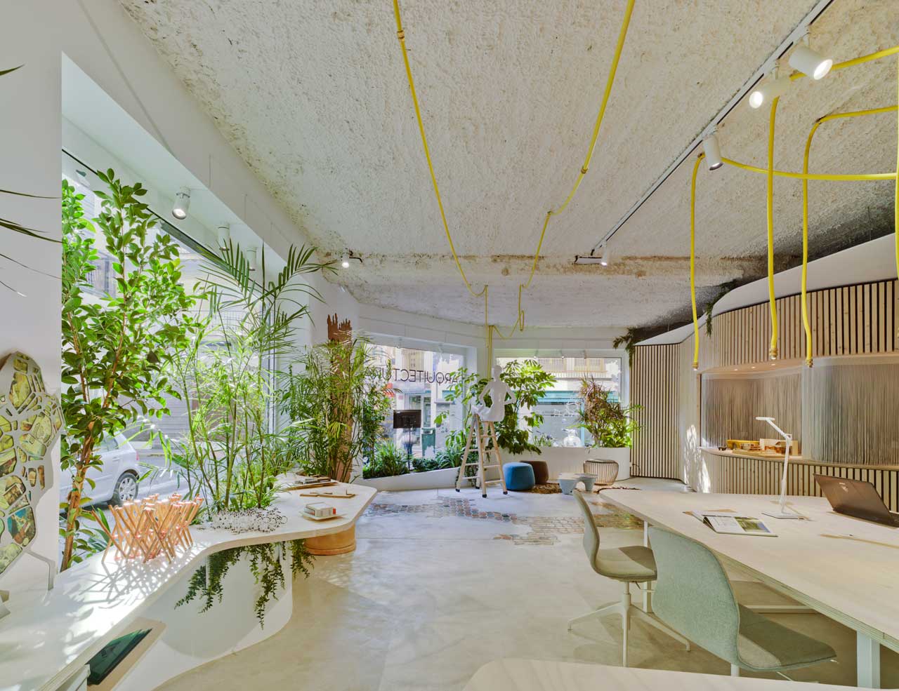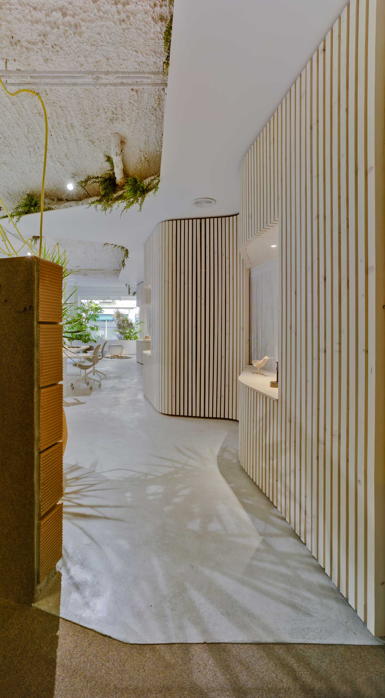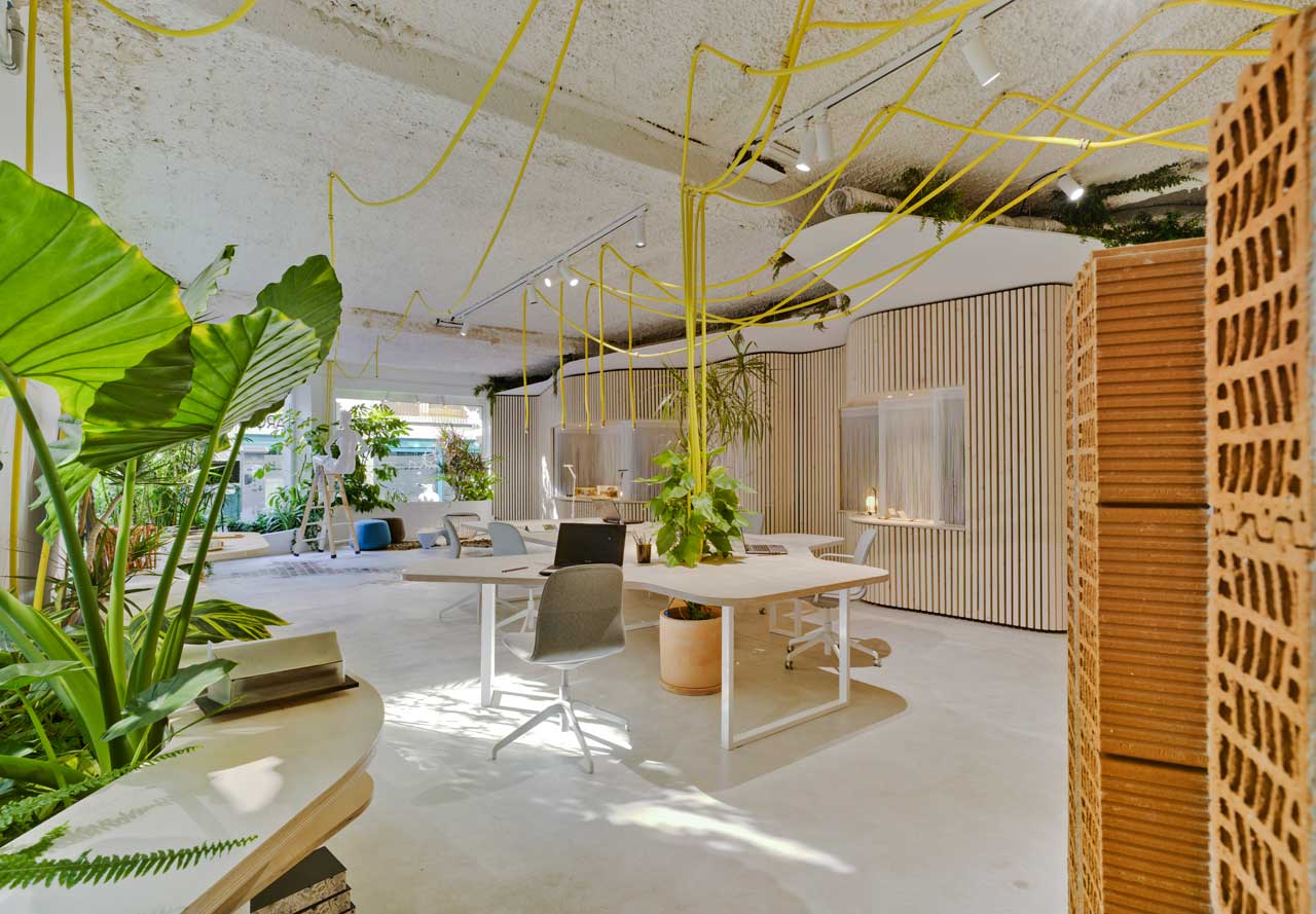 今天分享的是班牙WOHA新工作室,Antonio Maciá 设计的WOHA是他们位于西班牙埃尔切的新工作室。其概念是设计一个类似“室内庭院”的空间,其中包括一系列元素:花盆,工作台,装置,储藏室,陶瓷墙和卫生间。在窗户前,一系列的花盆围绕着四周排列,作为勾勒“天井”的一种方式,同时可以让植物吸收阳光。随着时间的推移,这些植物会像在户外一样生长并改变办公室的外观。垂直的松条形成了一个波浪状的墙壁,后面有一个白色的帘子,用来掩盖存储区域。天花板上挂着一系列黄色的水管,为植物提供水源。一面陶瓷墙为办公室后面的会议室提供了隐私。地毯有助于吸收声音,因此空间不需要关闭。一起欣赏