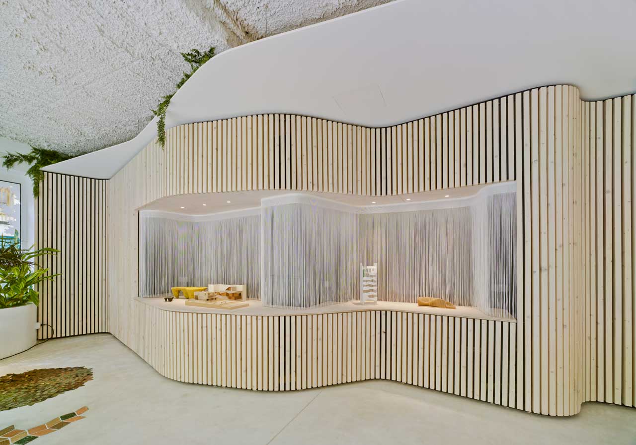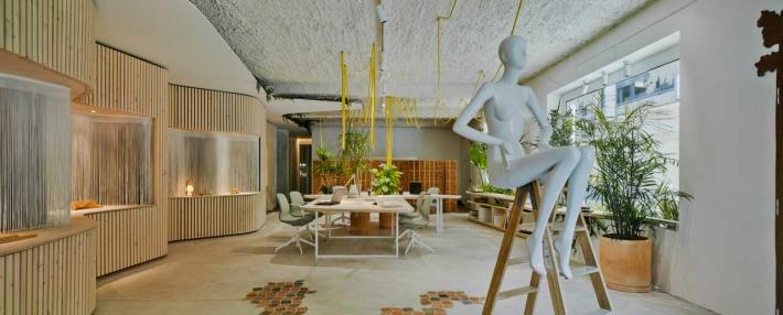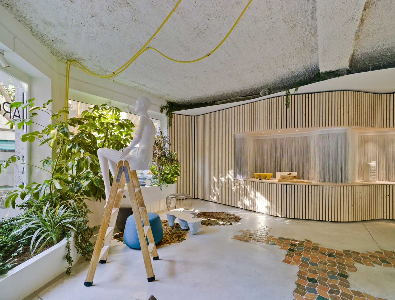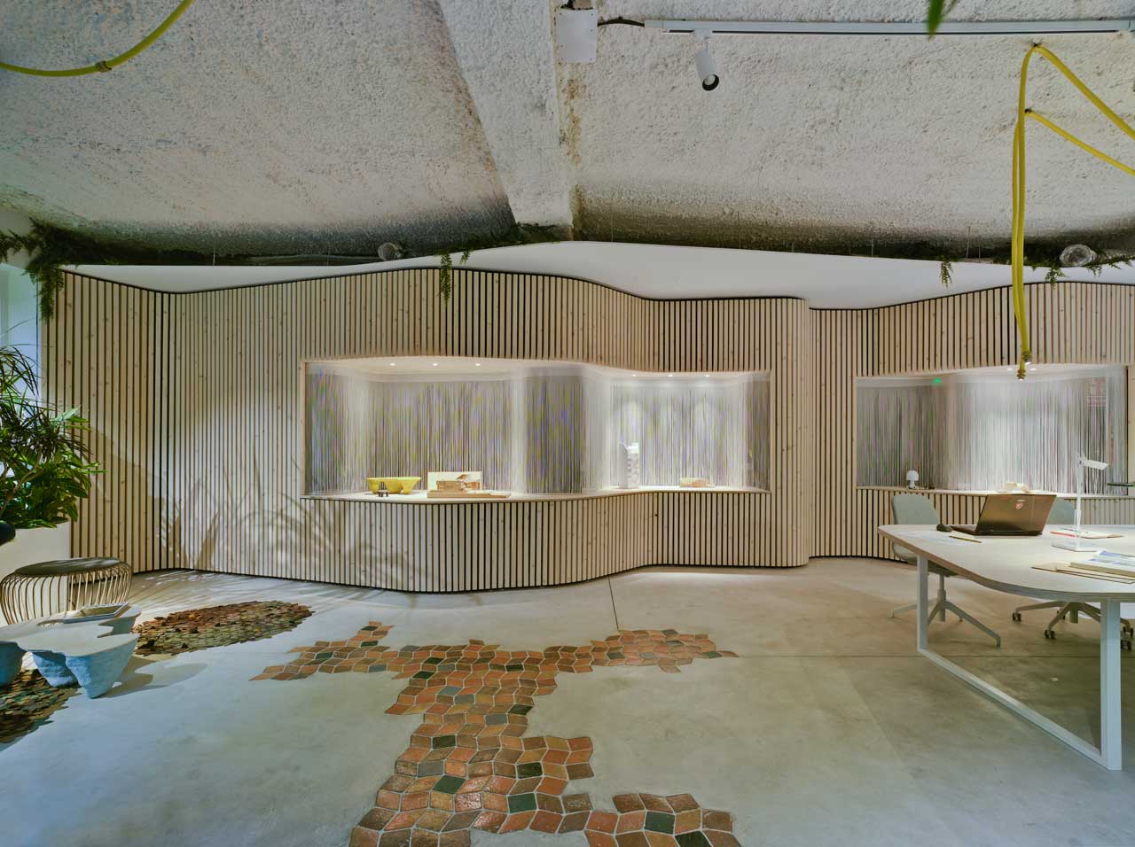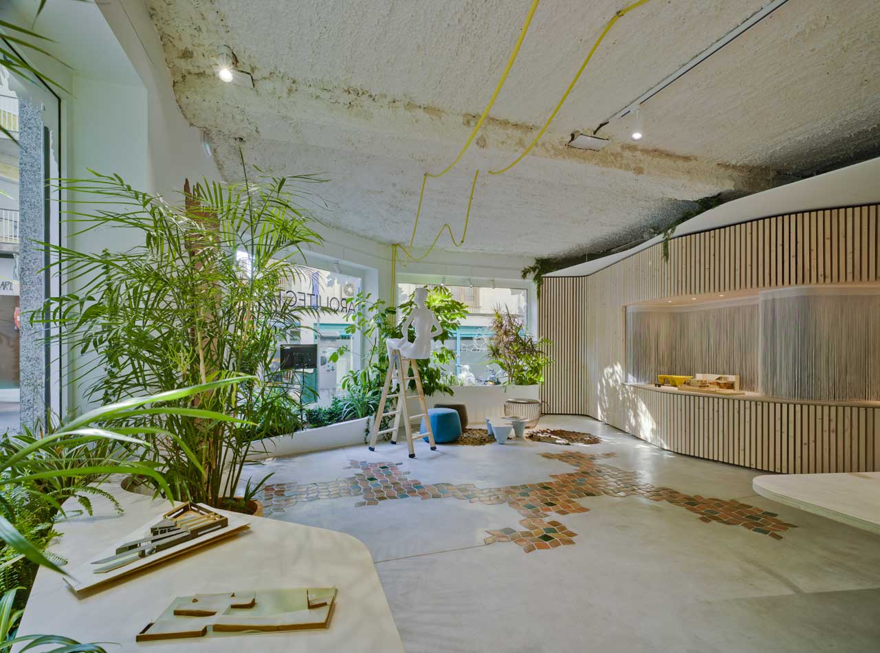 今天分享的是班牙WOHA新工作室,Antonio Maciá 设计的WOHA是他们位于西班牙埃尔切的新工作室。其概念是设计一个类似“室内庭院”的空间,其中包括一系列元素:花盆,工作台,装置,储藏室,陶瓷墙和卫生间。在窗户前,一系列的花盆围绕着四周排列,作为勾勒“天井”的一种方式,同时可以让植物吸收阳光。随着时间的推移,这些植物会像在户外一样生长并改变办公室的外观。垂直的松条形成了一个波浪状的墙壁,后面有一个白色的帘子,用来掩盖存储区域。天花板上挂着一系列黄色的水管,为植物提供水源。一面陶瓷墙为办公室后面的会议室提供了隐私。地毯有助于吸收声音,因此空间不需要关闭。一起欣赏