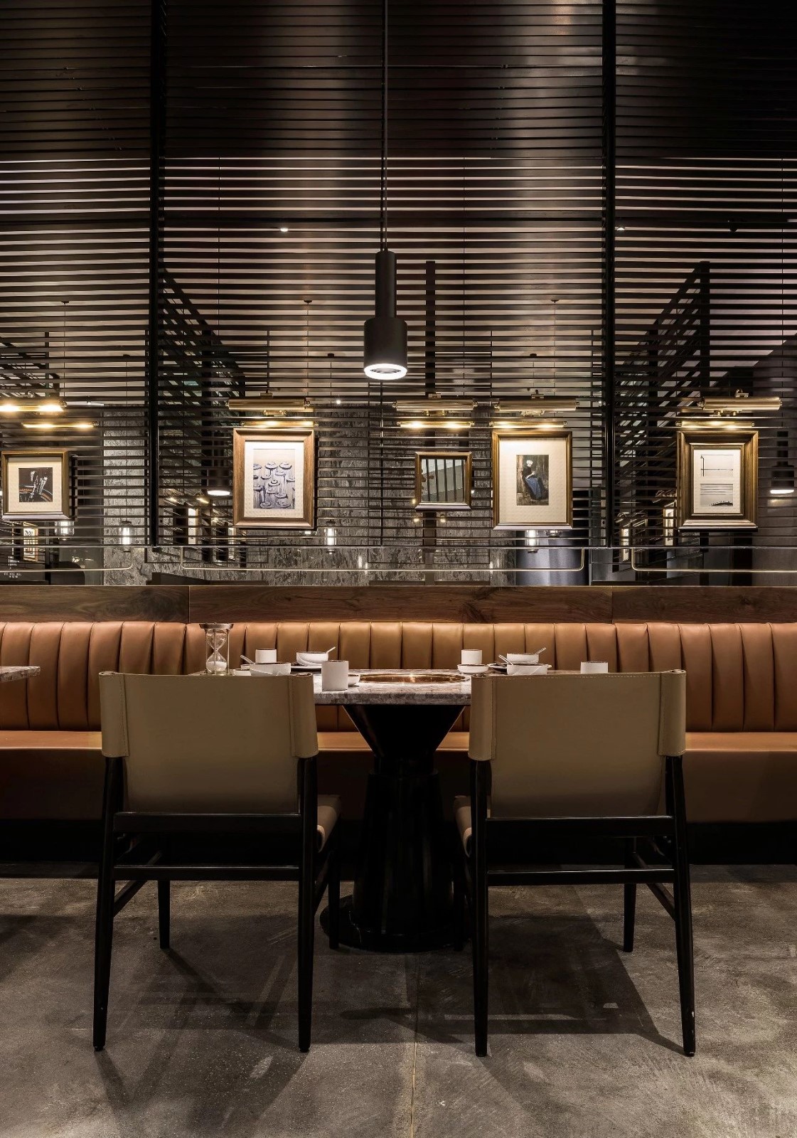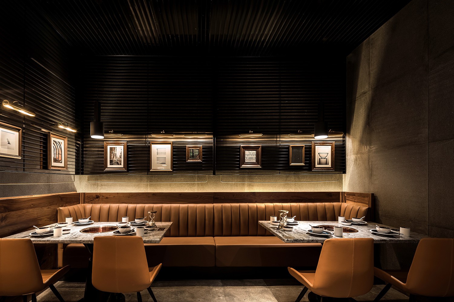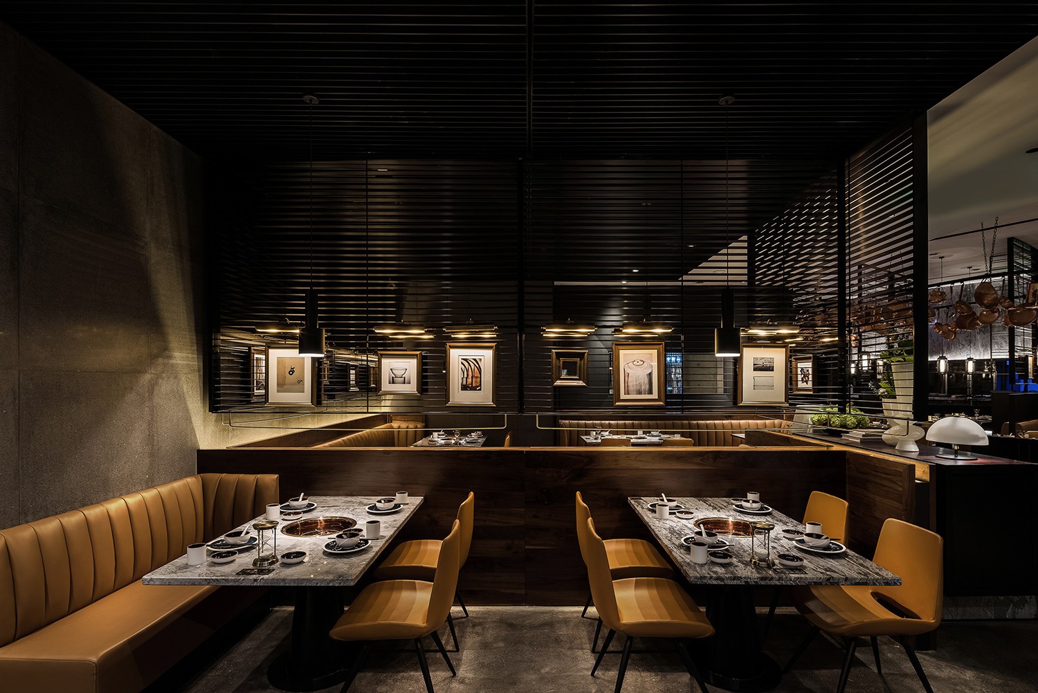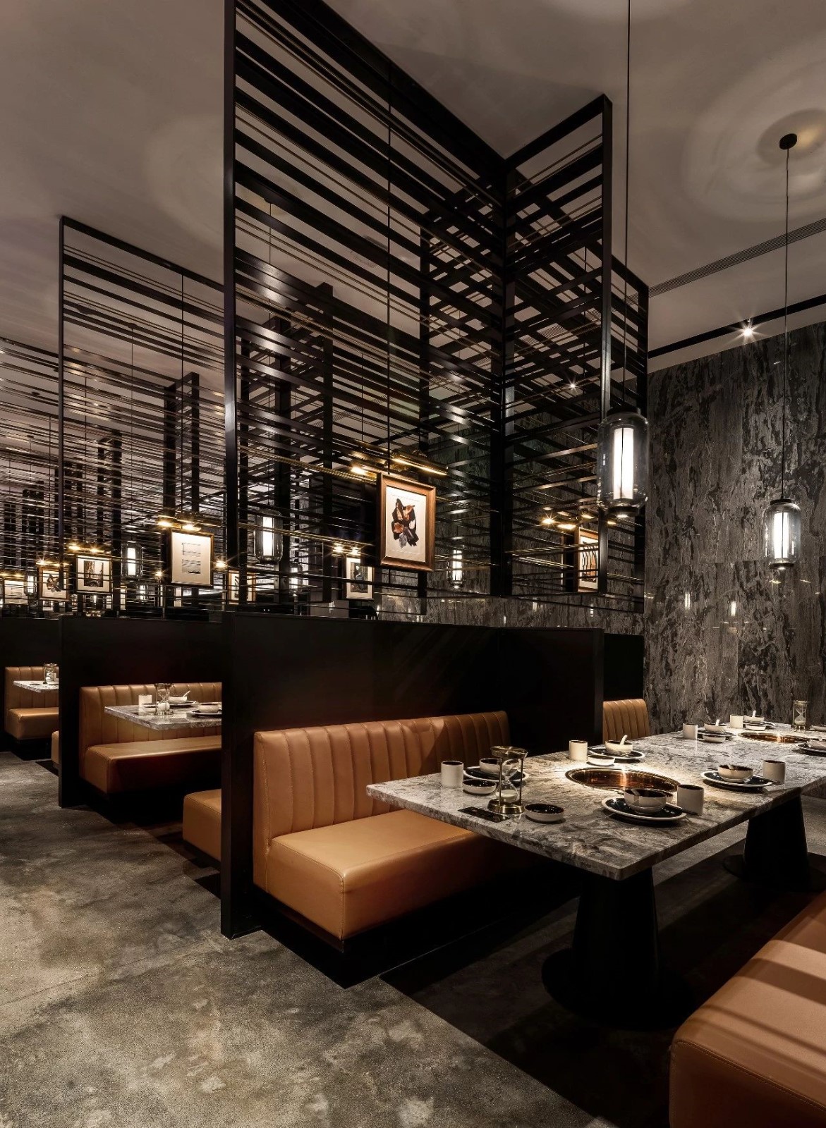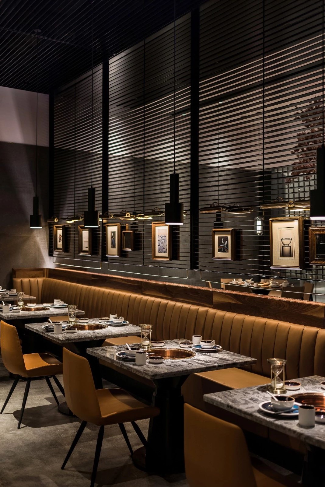 今天分享一家位于厦门万象城的椰子鸡火锅的餐厅,为了营造美食与艺术碰撞的氛围,设计师引入艺术陈设的设计概念。基于简约设计的原则,设计师用朴素的材料和精致干练的造型赋予该项目全新的空间体验。只有将食材色彩两者最大限度融合的地方,才能给人以“食”之最高享受,设计置换了橱窗展示手法来展示餐厅的特有文化。大厅空间置入悬浮屏风,围合出不同的就餐区域,每个就餐区域间隔而有透,让食客的视线在整个空间中游离。加上黑色不锈钢的装饰,令空间增添高贵典雅的气派。成一体的黑铁+木质不再是简单的陪衬,反而与皮布家具争奇斗艳,不同主题挂画丰富了空间的艺术氛围,让食客在就餐体验如同置身于美术馆。调动食客身上每一个细胞,让人们只想回归于食色性也的本质,吃个爽快。既能让食客专注的享用美食,又能在食客抬眼的瞬间感受艺术的魅力。更年轻的,更时尚的,甚至是更国际化的表达,锲合不断更新迭代客群,最高级表达就是“大道至简”。无处不在的点睛细节也冲淡了浓郁色感容易带来的审美疲劳,令食客们得以更舒适地享受用餐时光。一起欣赏