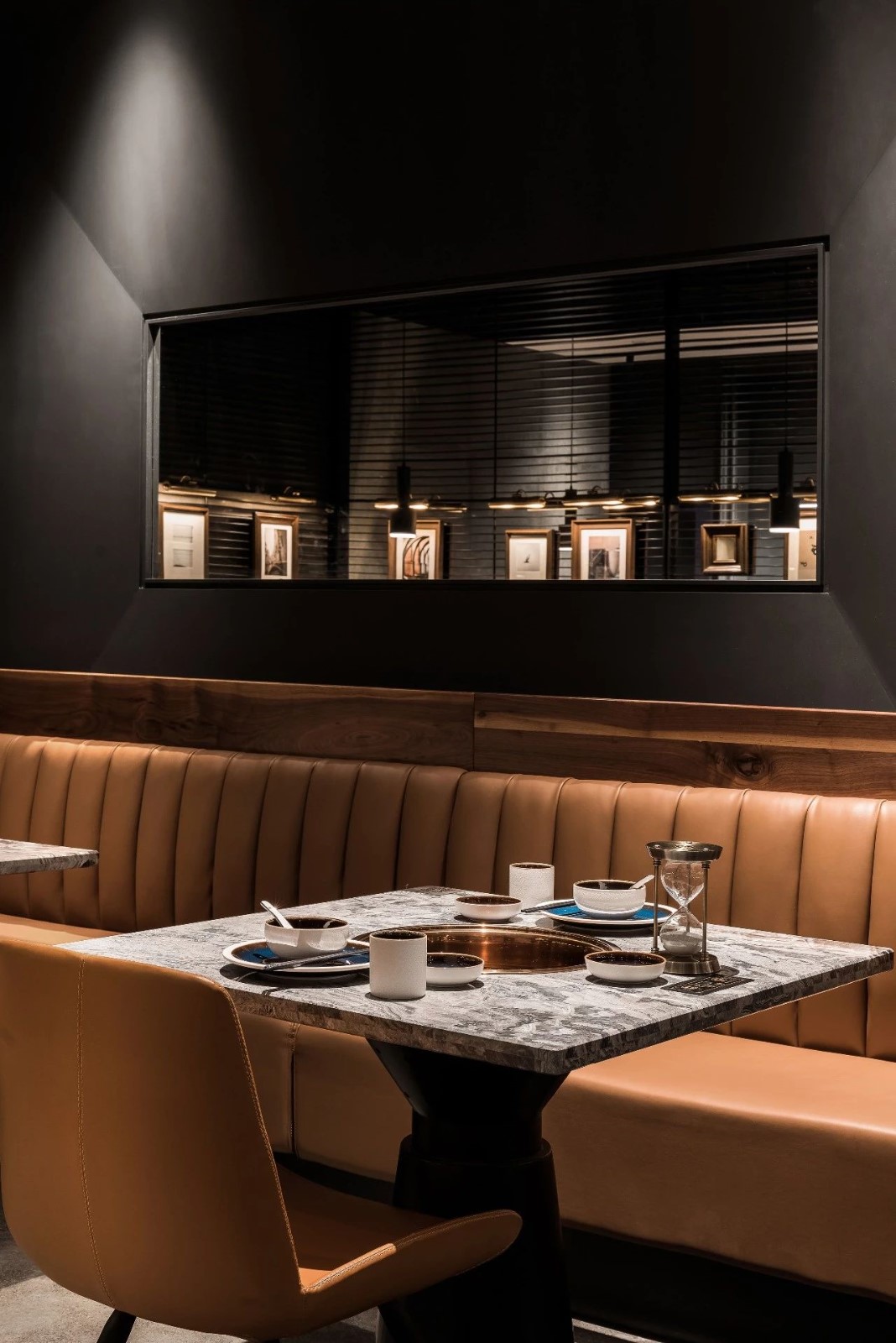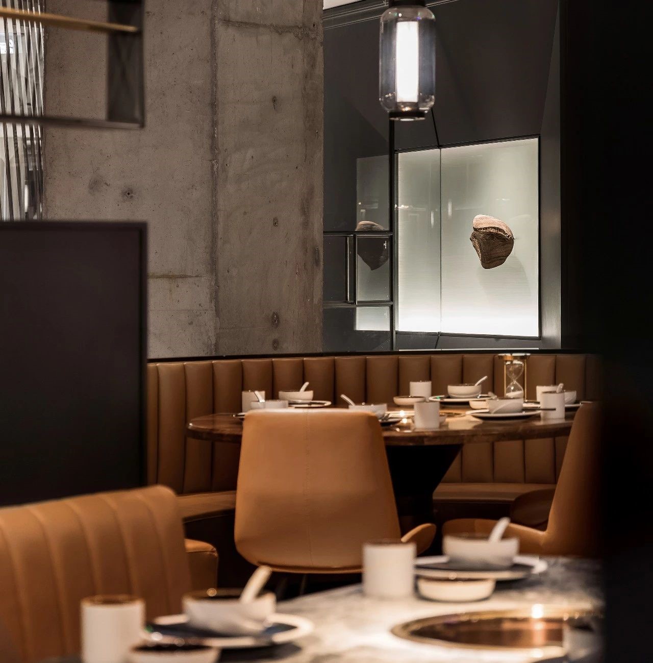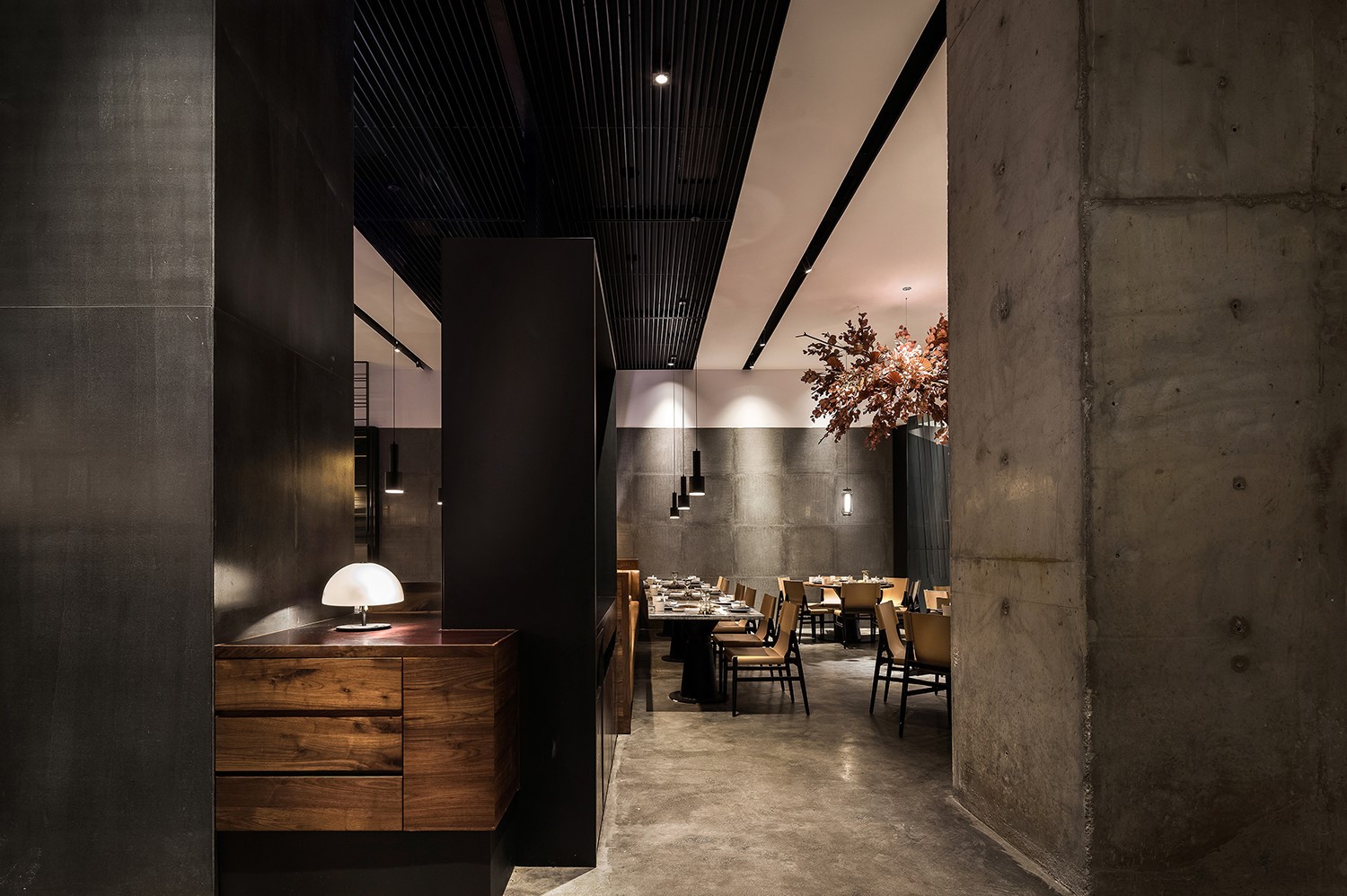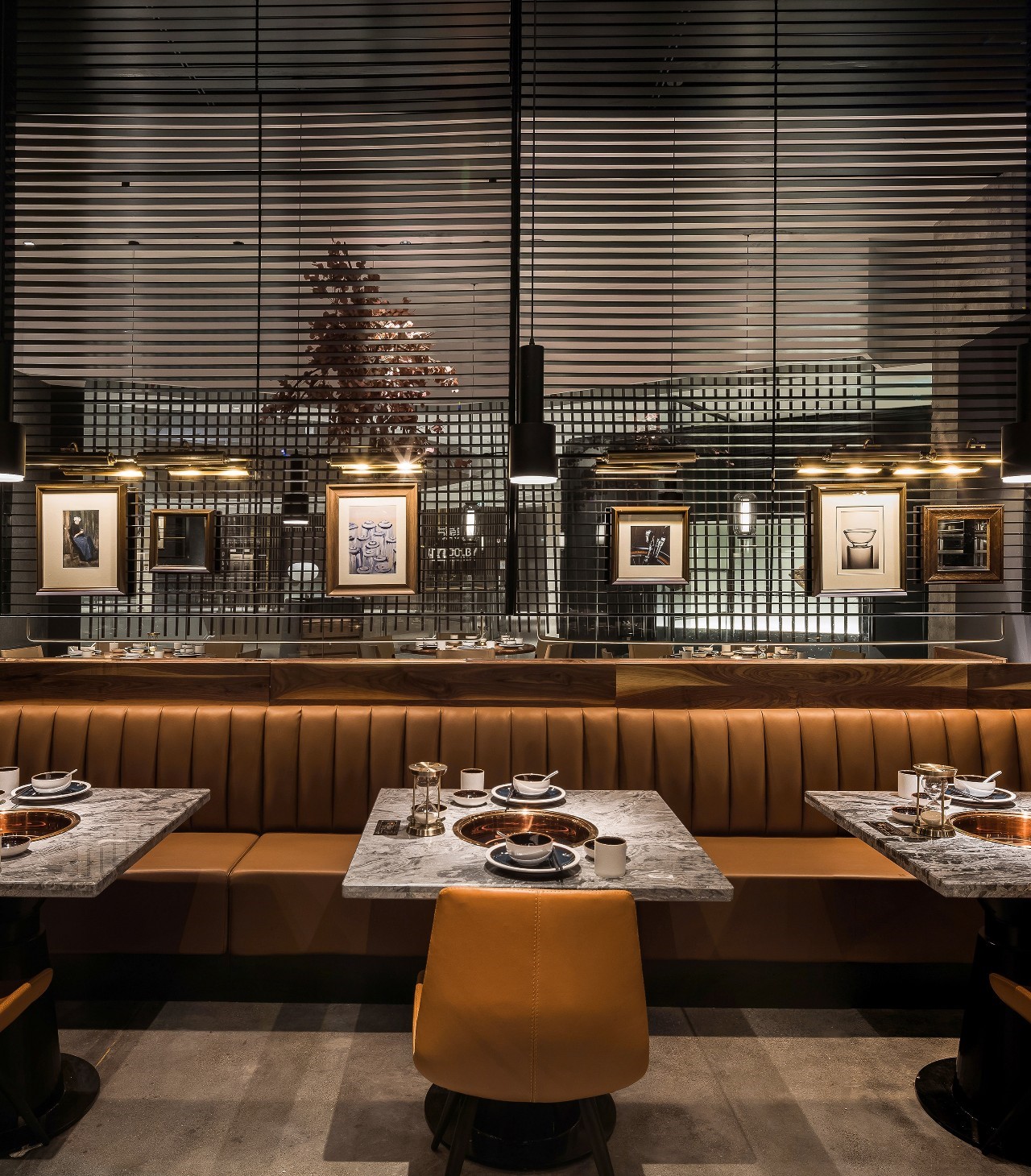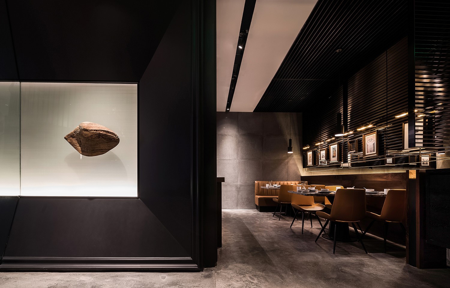 今天分享一家位于厦门万象城的椰子鸡火锅的餐厅,为了营造美食与艺术碰撞的氛围,设计师引入艺术陈设的设计概念。基于简约设计的原则,设计师用朴素的材料和精致干练的造型赋予该项目全新的空间体验。只有将食材色彩两者最大限度融合的地方,才能给人以“食”之最高享受,设计置换了橱窗展示手法来展示餐厅的特有文化。大厅空间置入悬浮屏风,围合出不同的就餐区域,每个就餐区域间隔而有透,让食客的视线在整个空间中游离。加上黑色不锈钢的装饰,令空间增添高贵典雅的气派。成一体的黑铁+木质不再是简单的陪衬,反而与皮布家具争奇斗艳,不同主题挂画丰富了空间的艺术氛围,让食客在就餐体验如同置身于美术馆。调动食客身上每一个细胞,让人们只想回归于食色性也的本质,吃个爽快。既能让食客专注的享用美食,又能在食客抬眼的瞬间感受艺术的魅力。更年轻的,更时尚的,甚至是更国际化的表达,锲合不断更新迭代客群,最高级表达就是“大道至简”。无处不在的点睛细节也冲淡了浓郁色感容易带来的审美疲劳,令食客们得以更舒适地享受用餐时光。一起欣赏