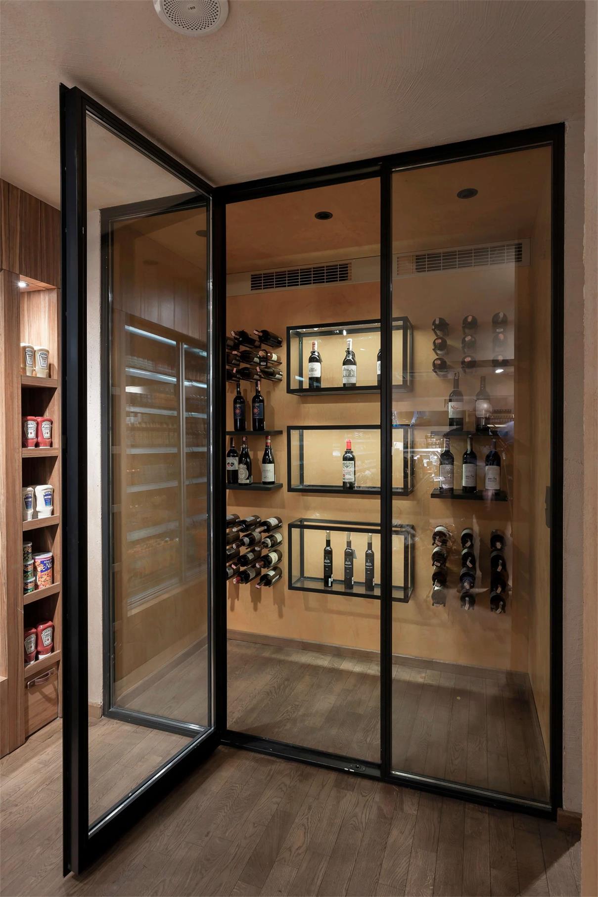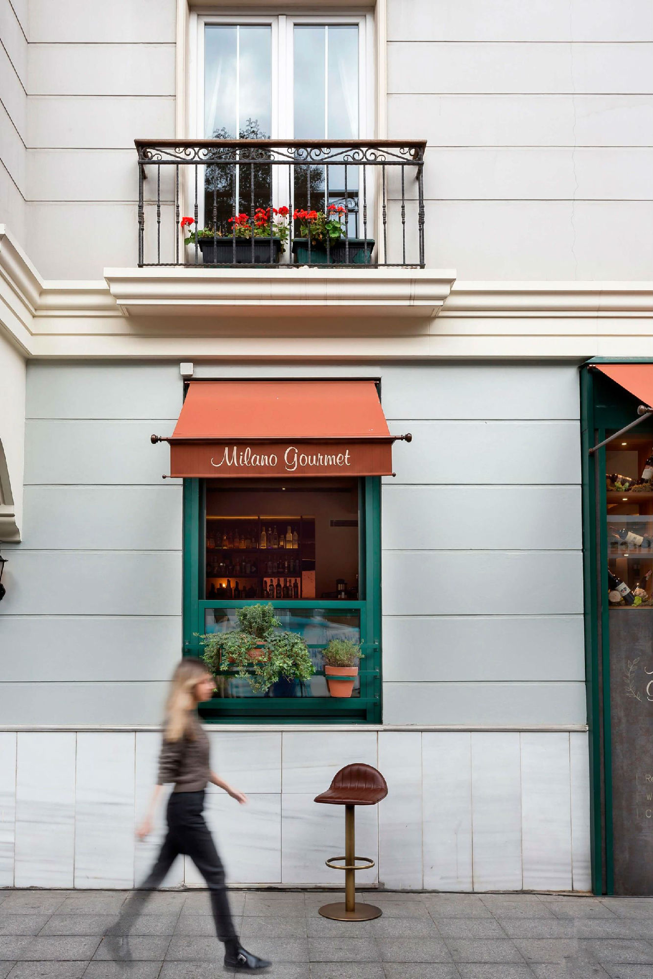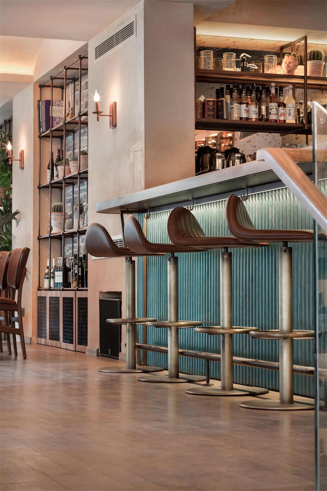 餐厅外立面有着绿色的外观和与之融为一体的绿色植物。赤土色的遮阳帘反射到室内空间,呈现温暖的室内氛围。为了吸引游客,立面保持透明,通过一个熟食冰箱的部分,给人一种熟食身份的暗示。