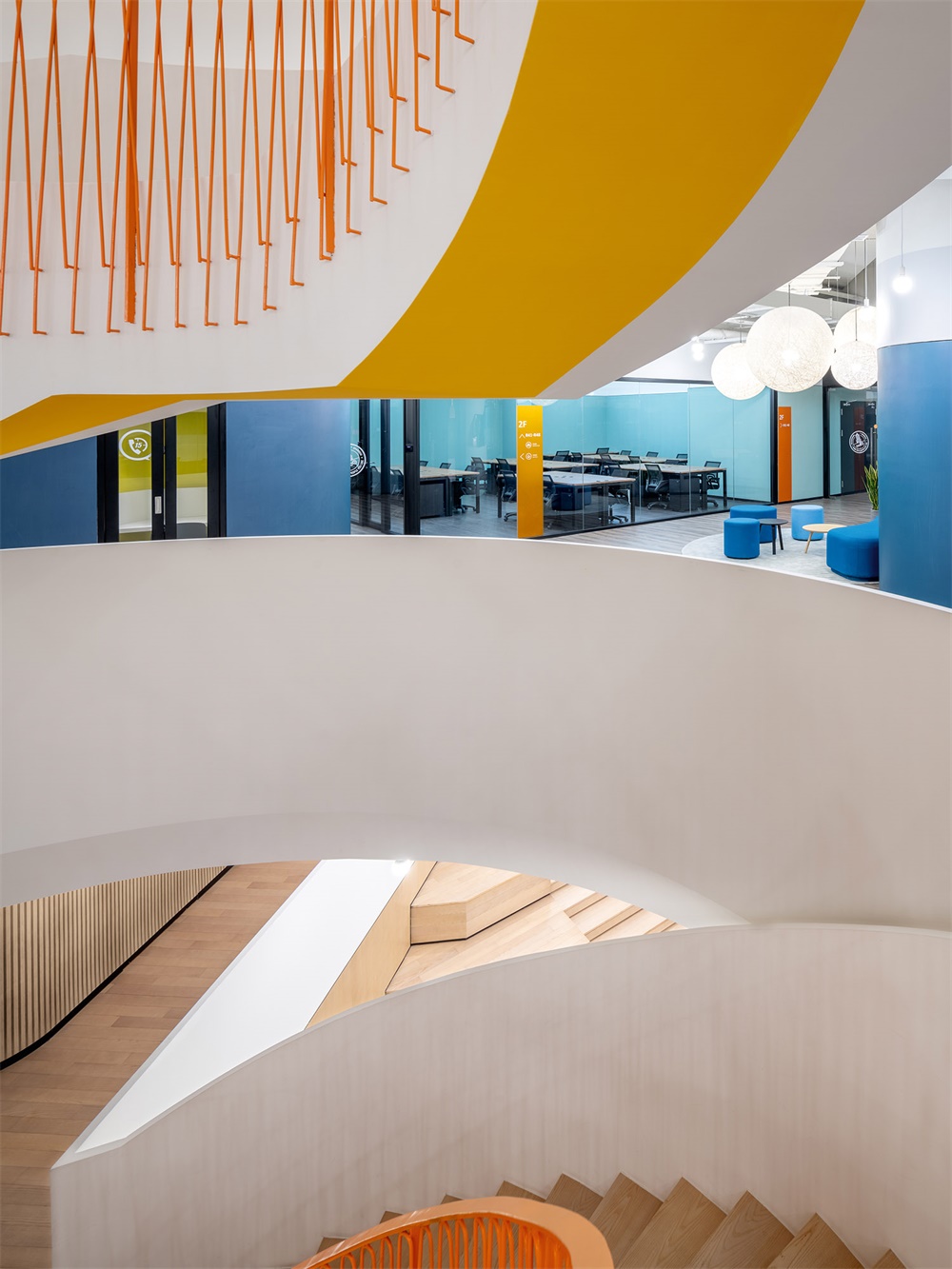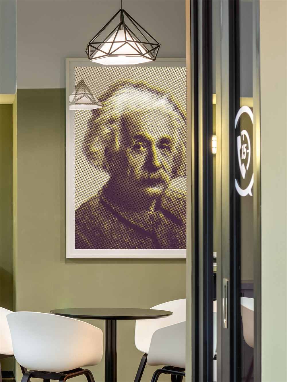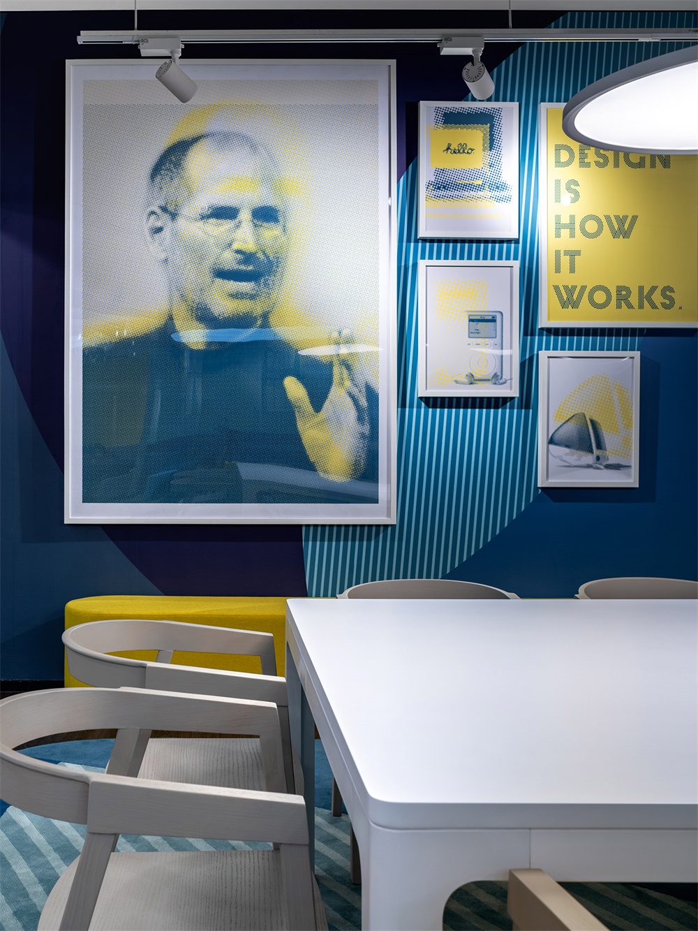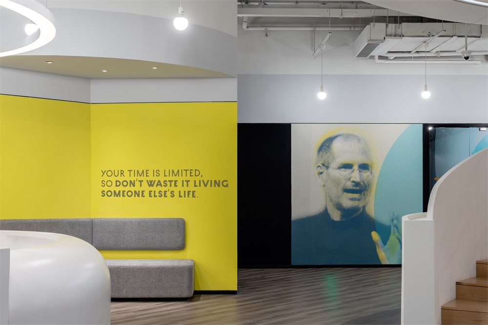 大厦中的每一个楼层均有专属的颜色和主题。各层的主题围绕着名人展开,例如著名的“行动派”乔布斯、马云及贝聿铭等。各个名人的艺术肖像点缀了整个墙面,为每个楼层赋予不同的个性。每个楼层采用的不同几何图案和色彩设计也增加了对比性,为不同行业和领域的人群提供了激发灵感的多样化工作环境。