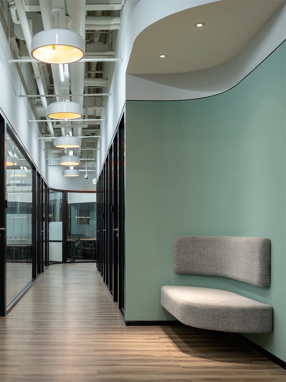 二层以上的每个楼层分为多种不同功能区域。每层设有一个前台和多个大小不一的会议室,空间规格由两人至24人不等。除会议室外,每层还设立了强调私密性的讨论空间,适于小规模讨论或者通话。空间风格开敞,通透而自由,地面以流平水泥和水磨石为特征。楼上的办公区域空间划分紧凑合理,为专注工作创造了理想条件。