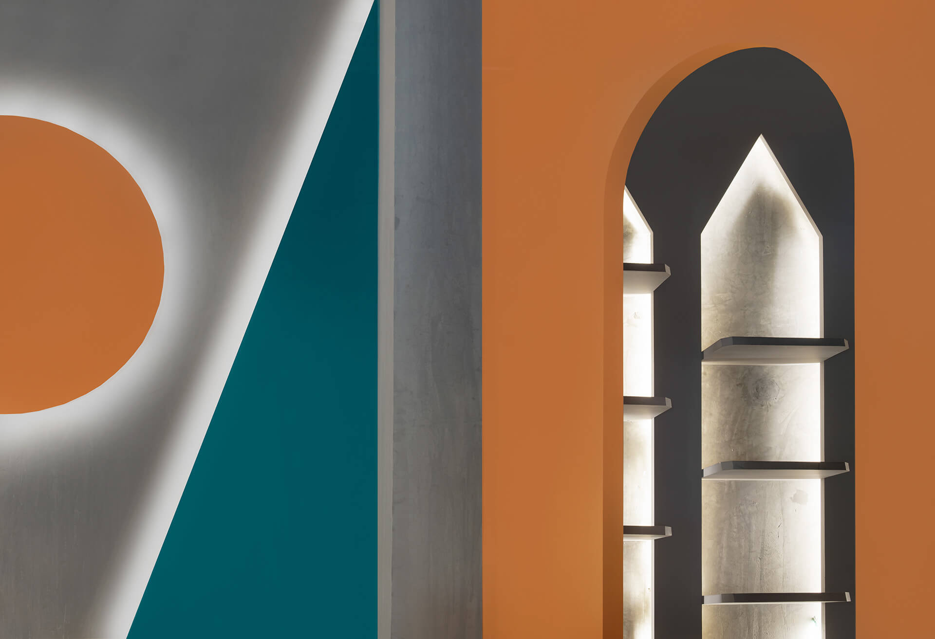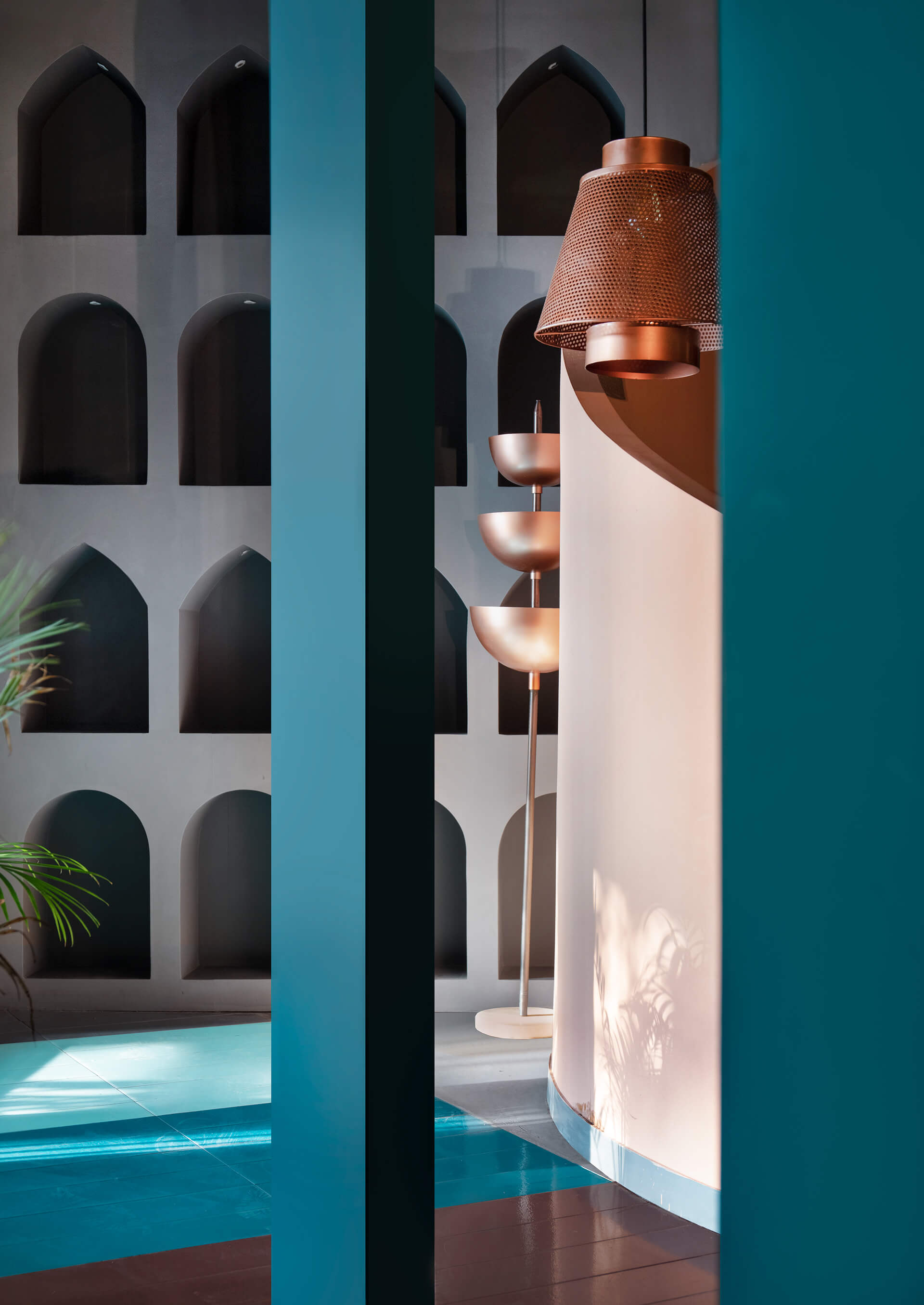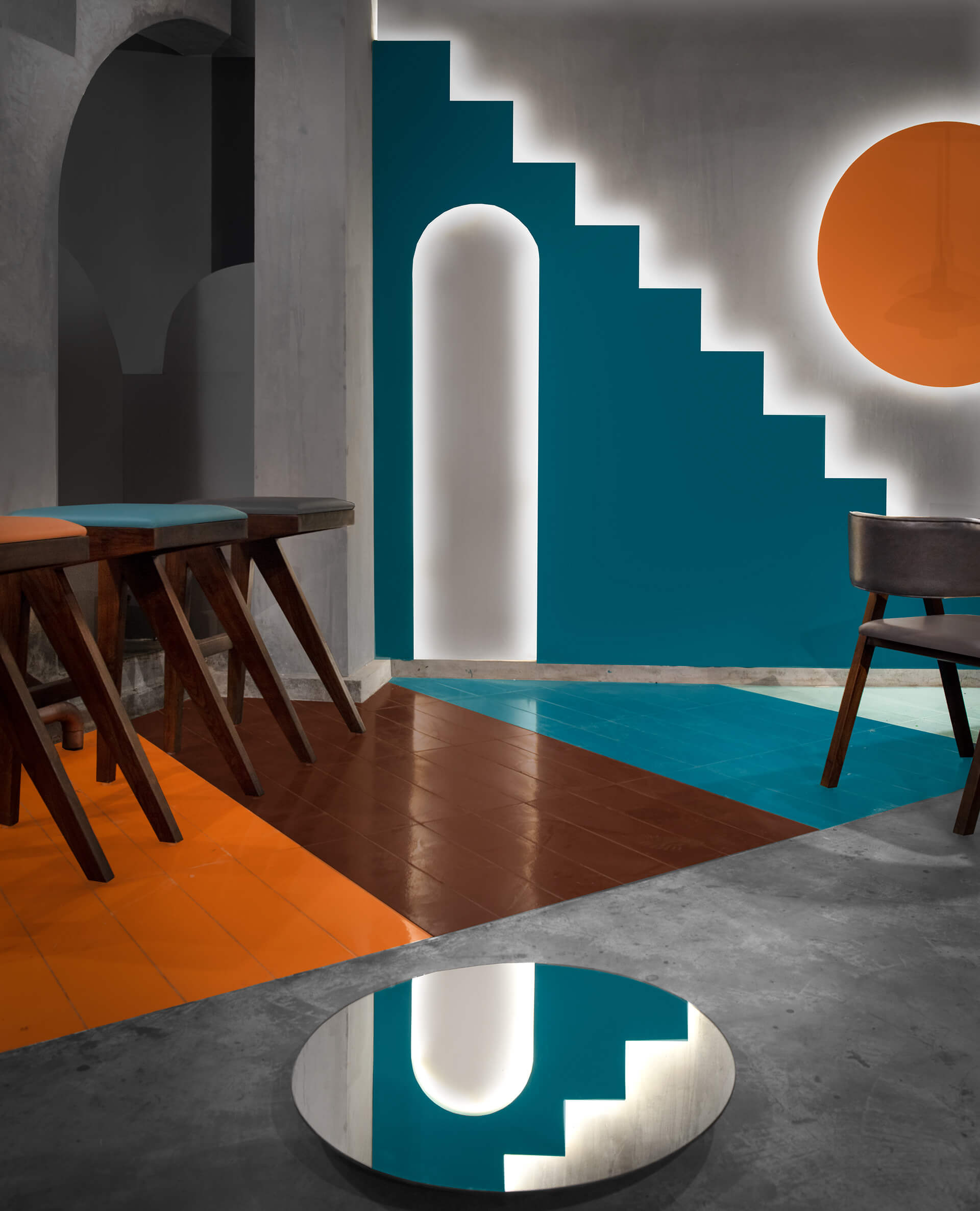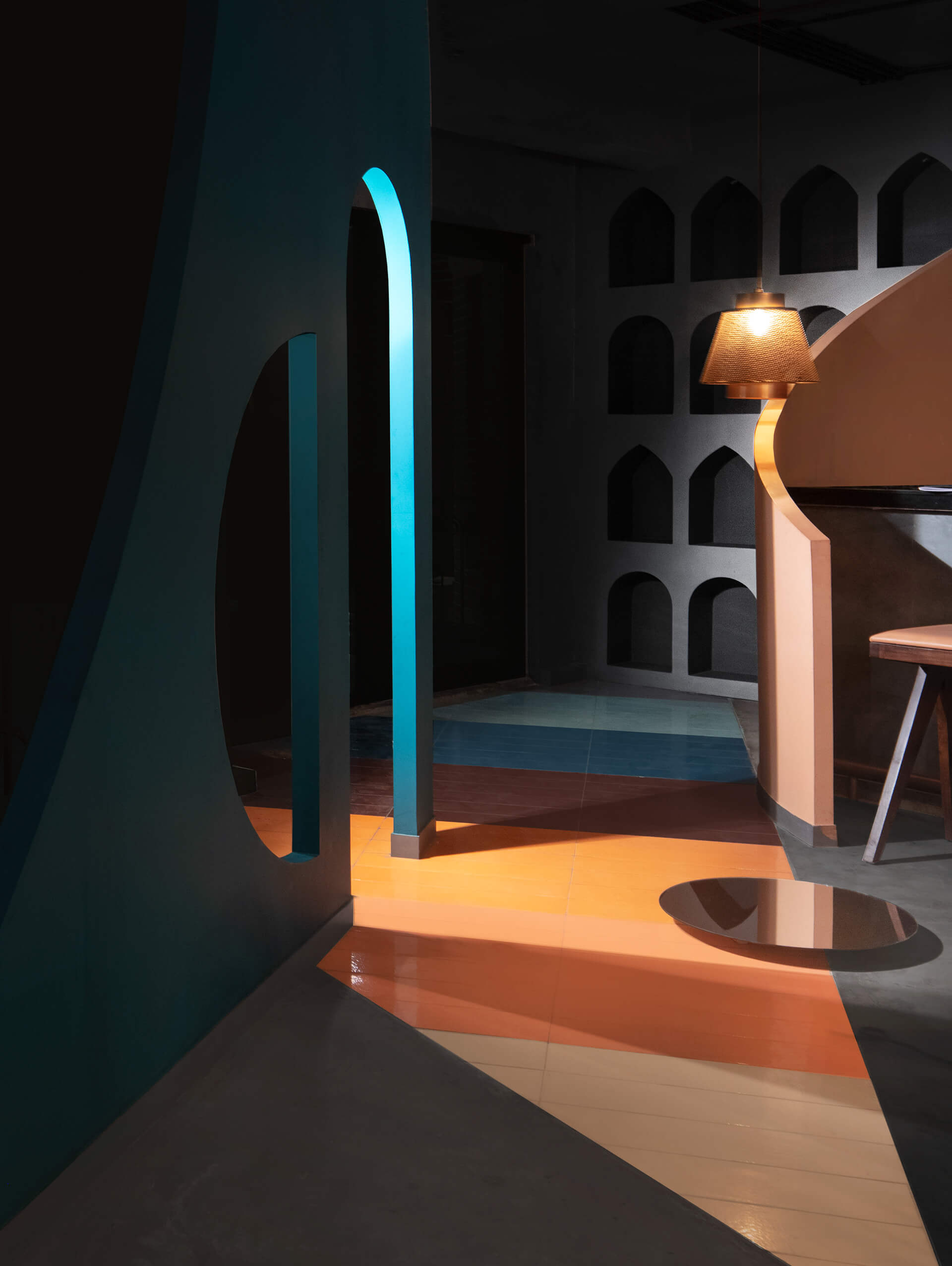 在场地的中心,还创建了一排排有三角形或拱形壁龛的特色墙。虽然大部分地板都铺上了混凝土,但有些地方却镶嵌了倾斜的棕色、橙色和天蓝色瓷砖。