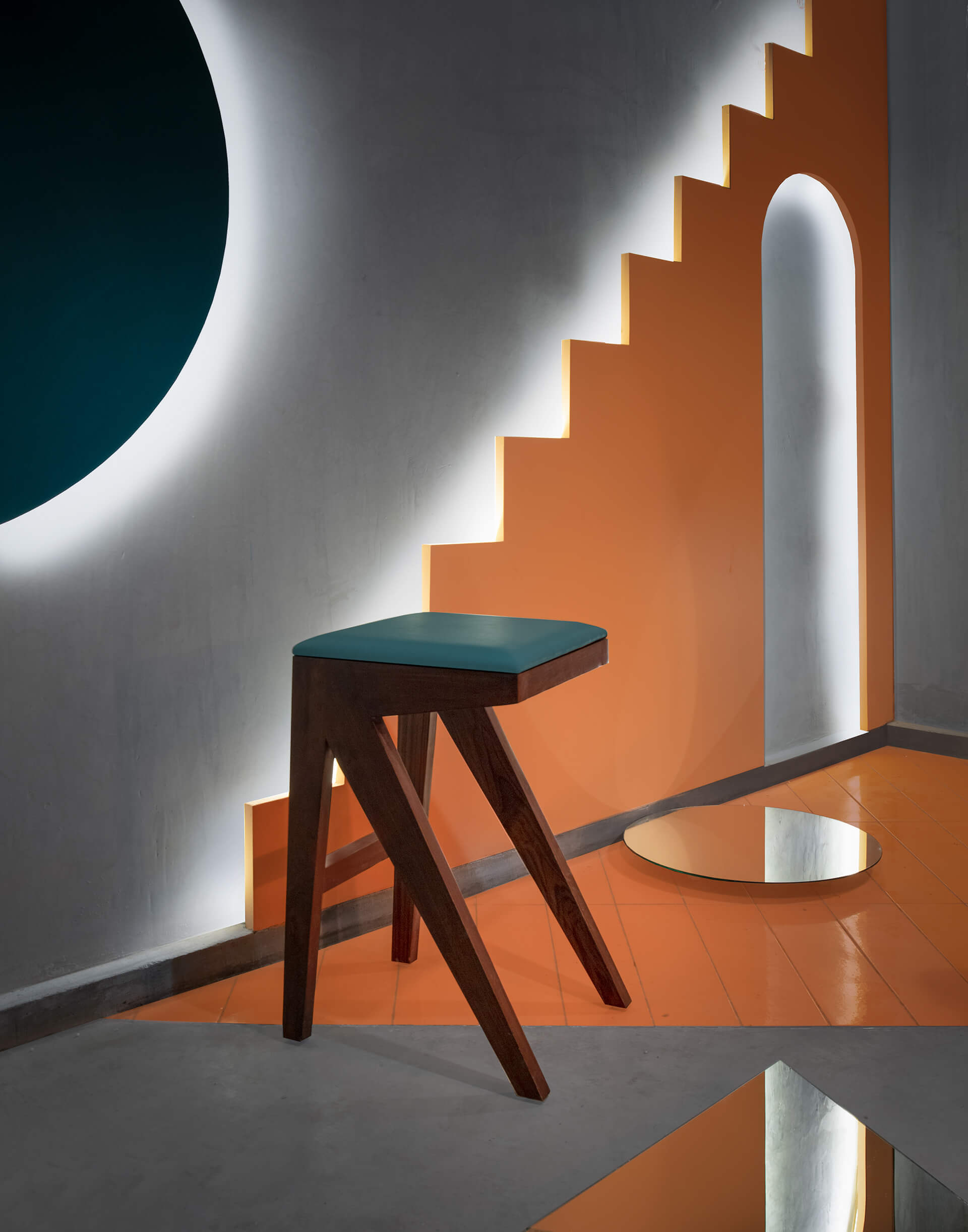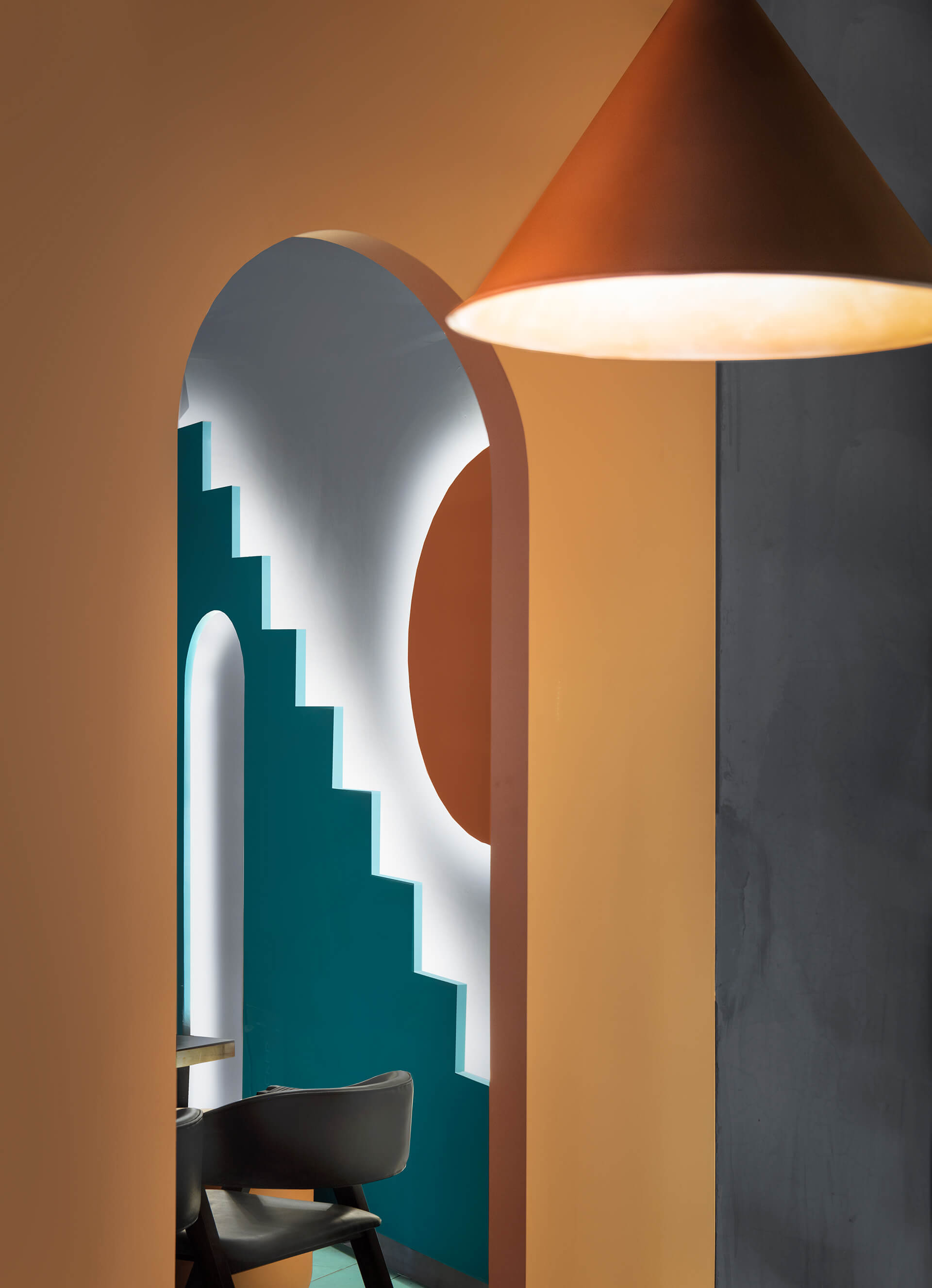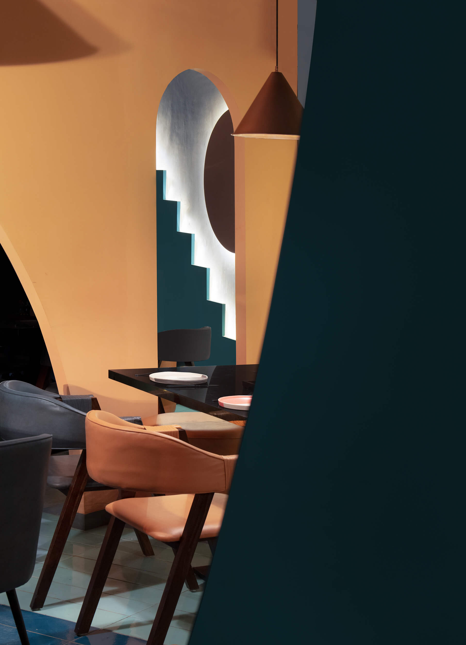 在场地的中心,还创建了一排排有三角形或拱形壁龛的特色墙。虽然大部分地板都铺上了混凝土,但有些地方却镶嵌了倾斜的棕色、橙色和天蓝色瓷砖。