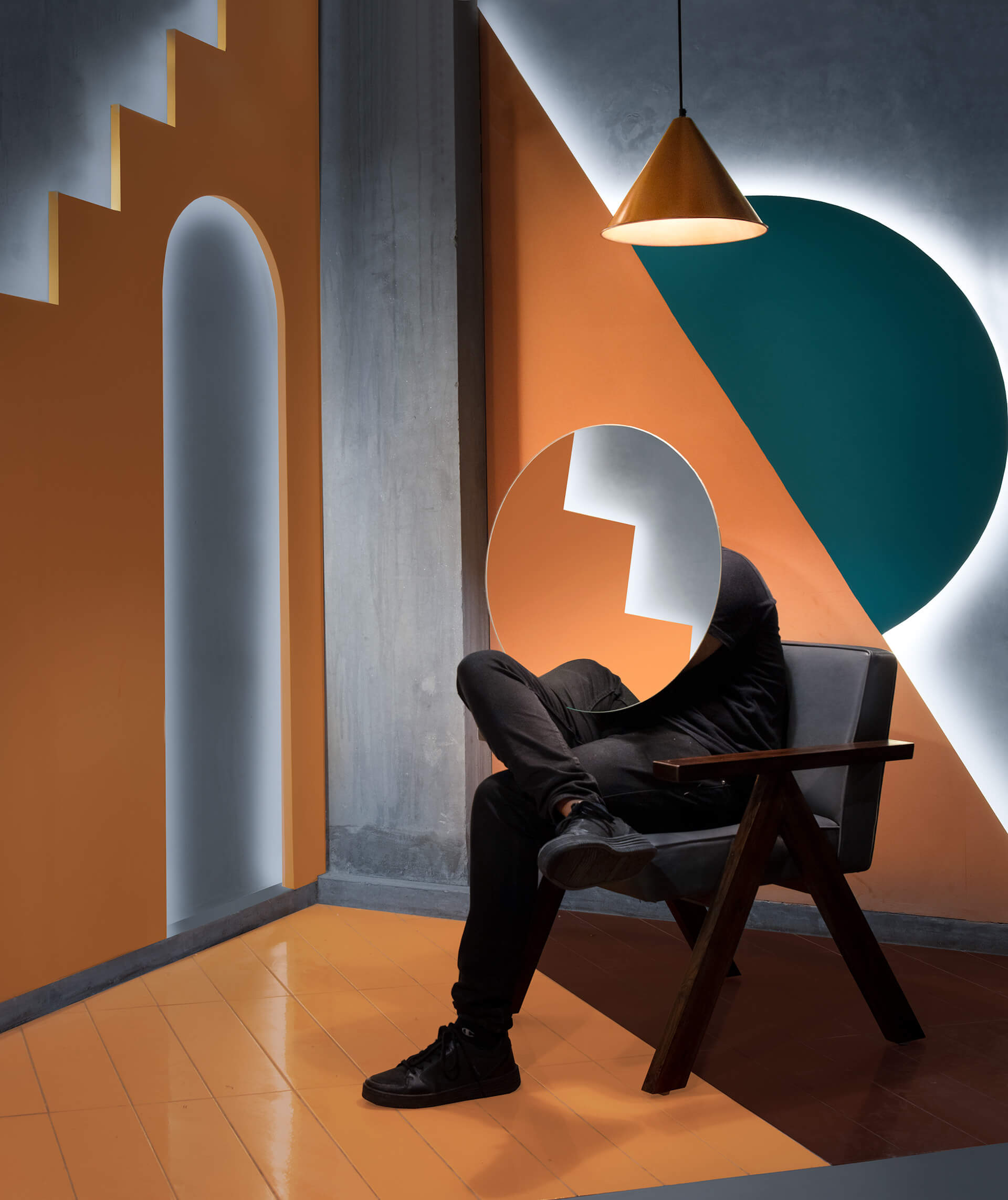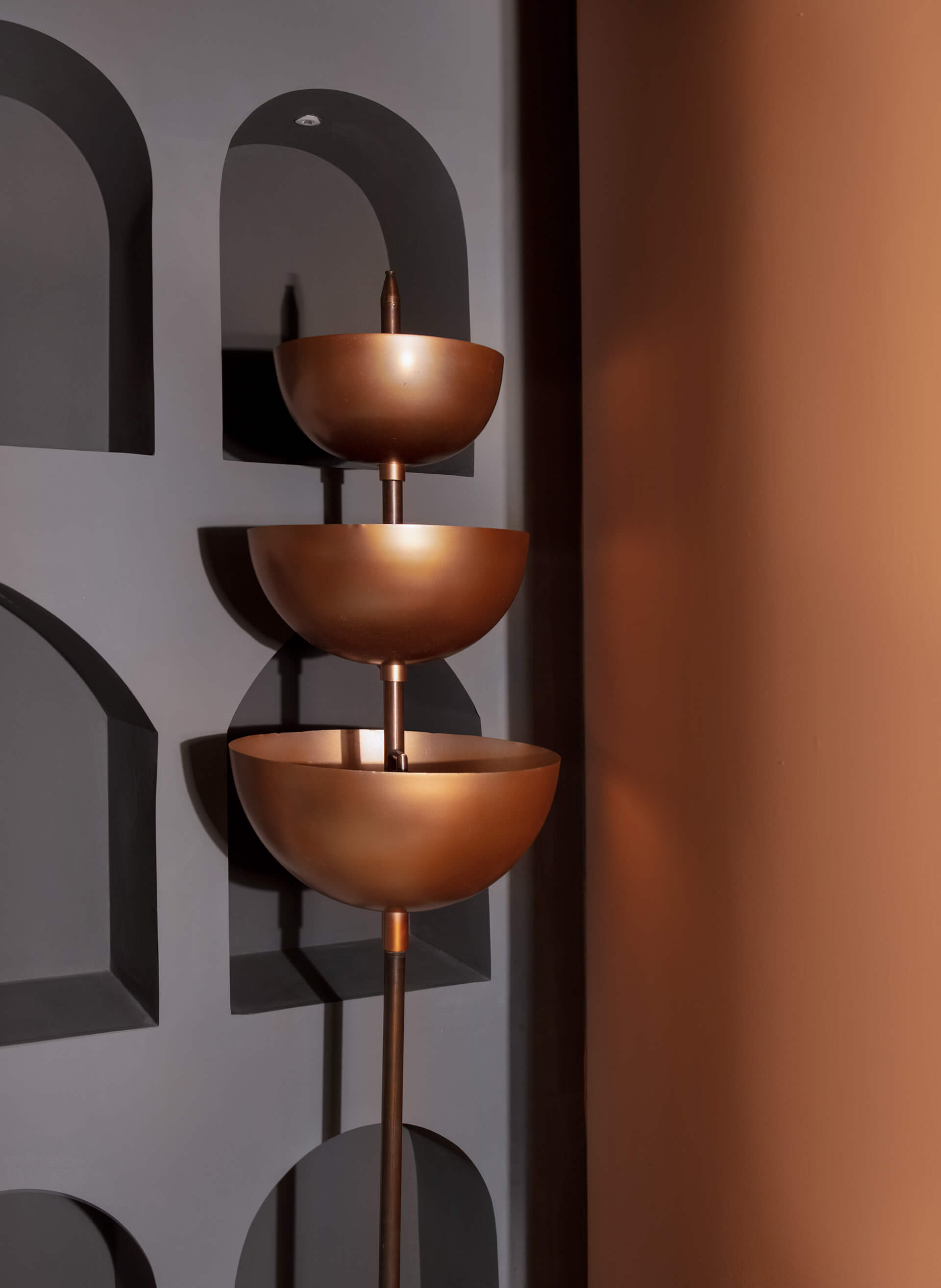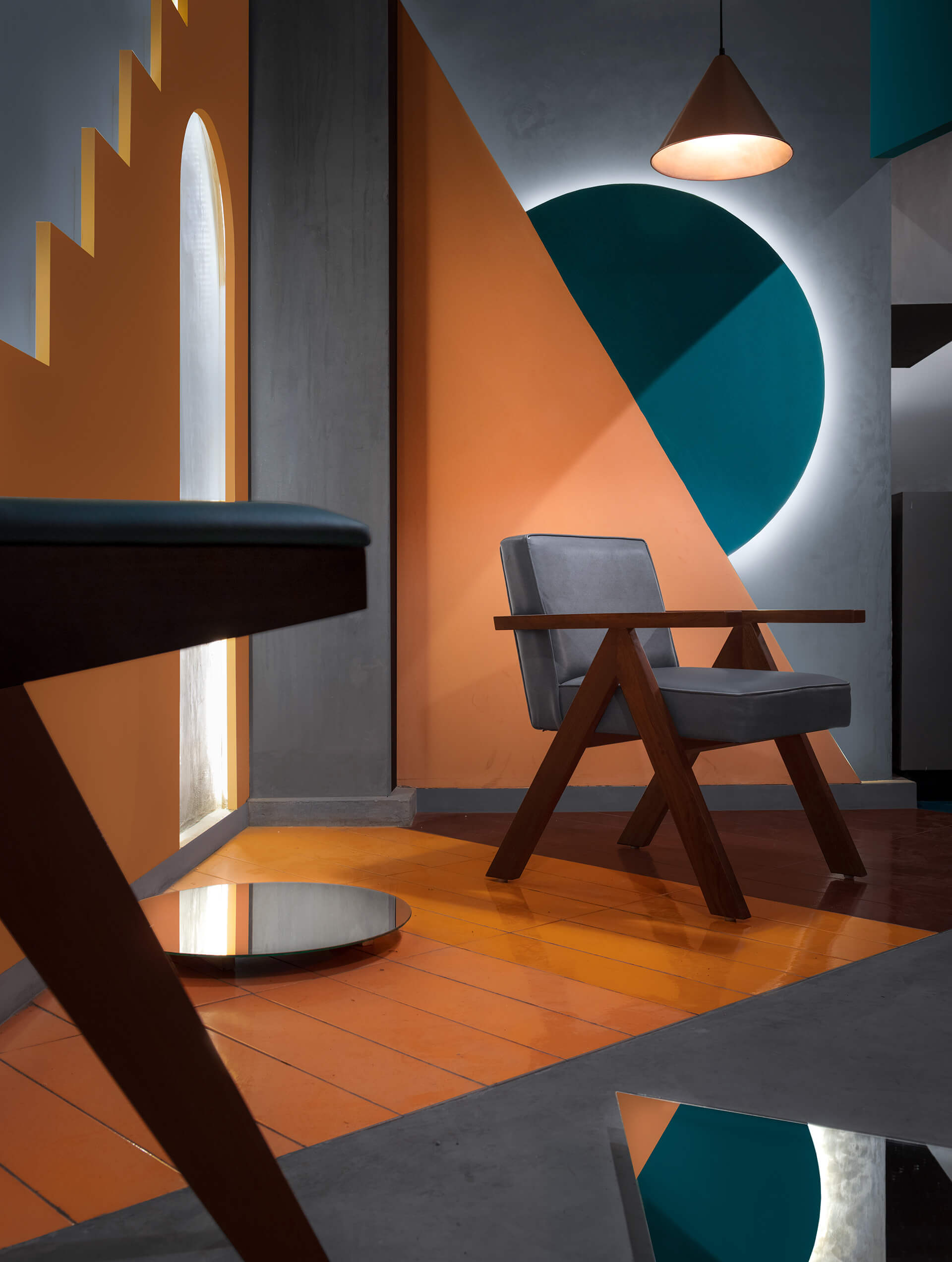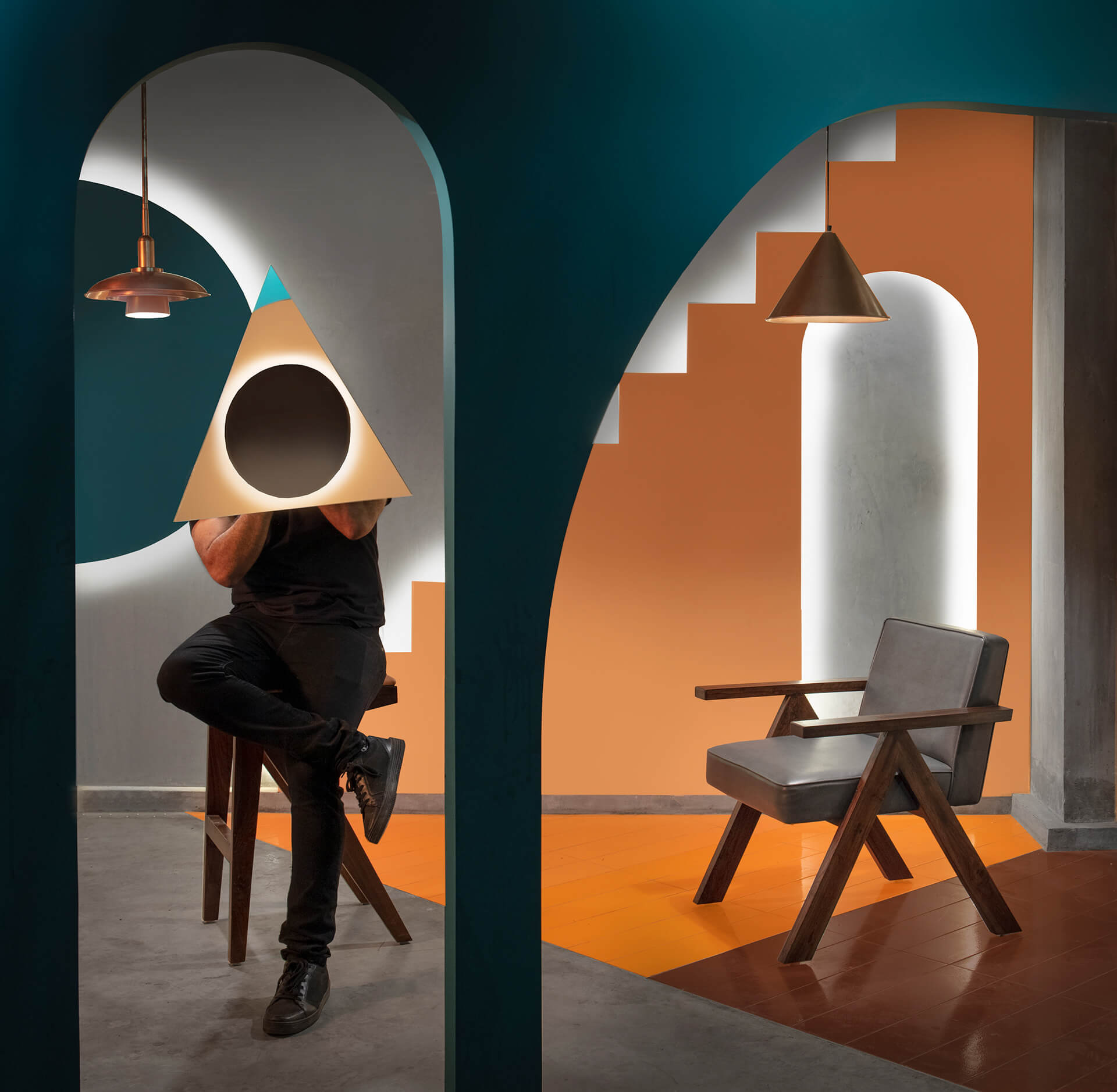 在场地的中心,还创建了一排排有三角形或拱形壁龛的特色墙。虽然大部分地板都铺上了混凝土,但有些地方却镶嵌了倾斜的棕色、橙色和天蓝色瓷砖。
