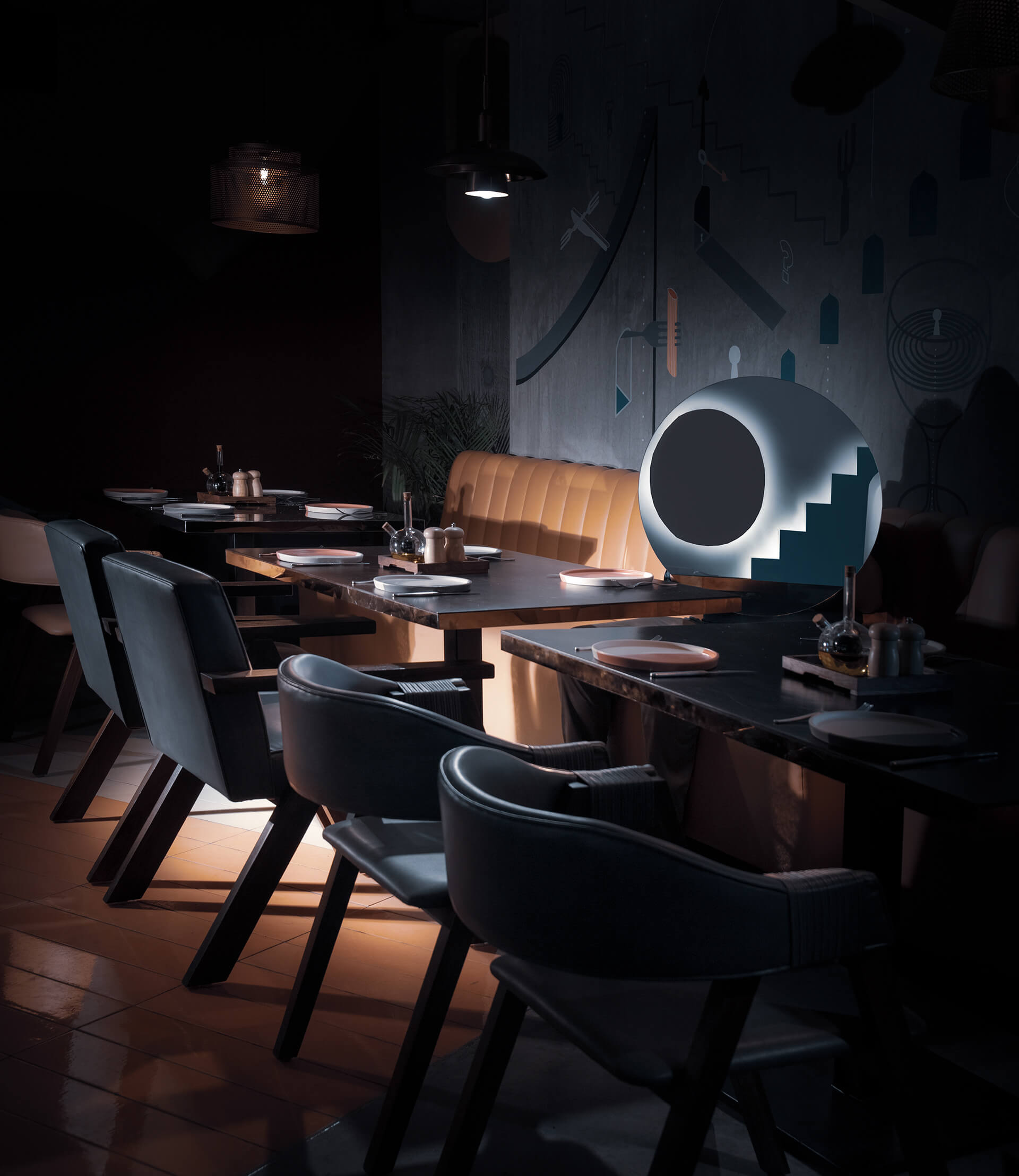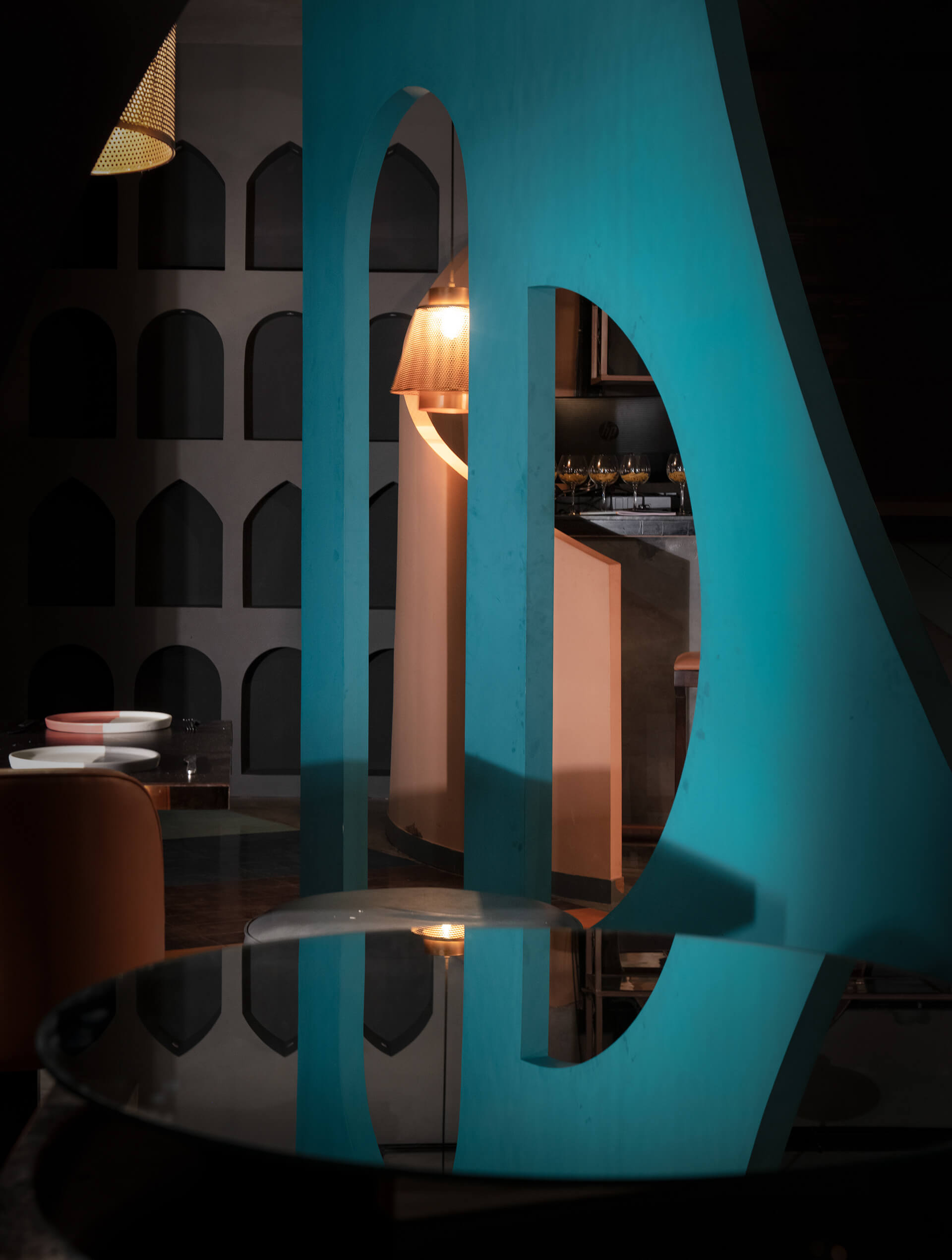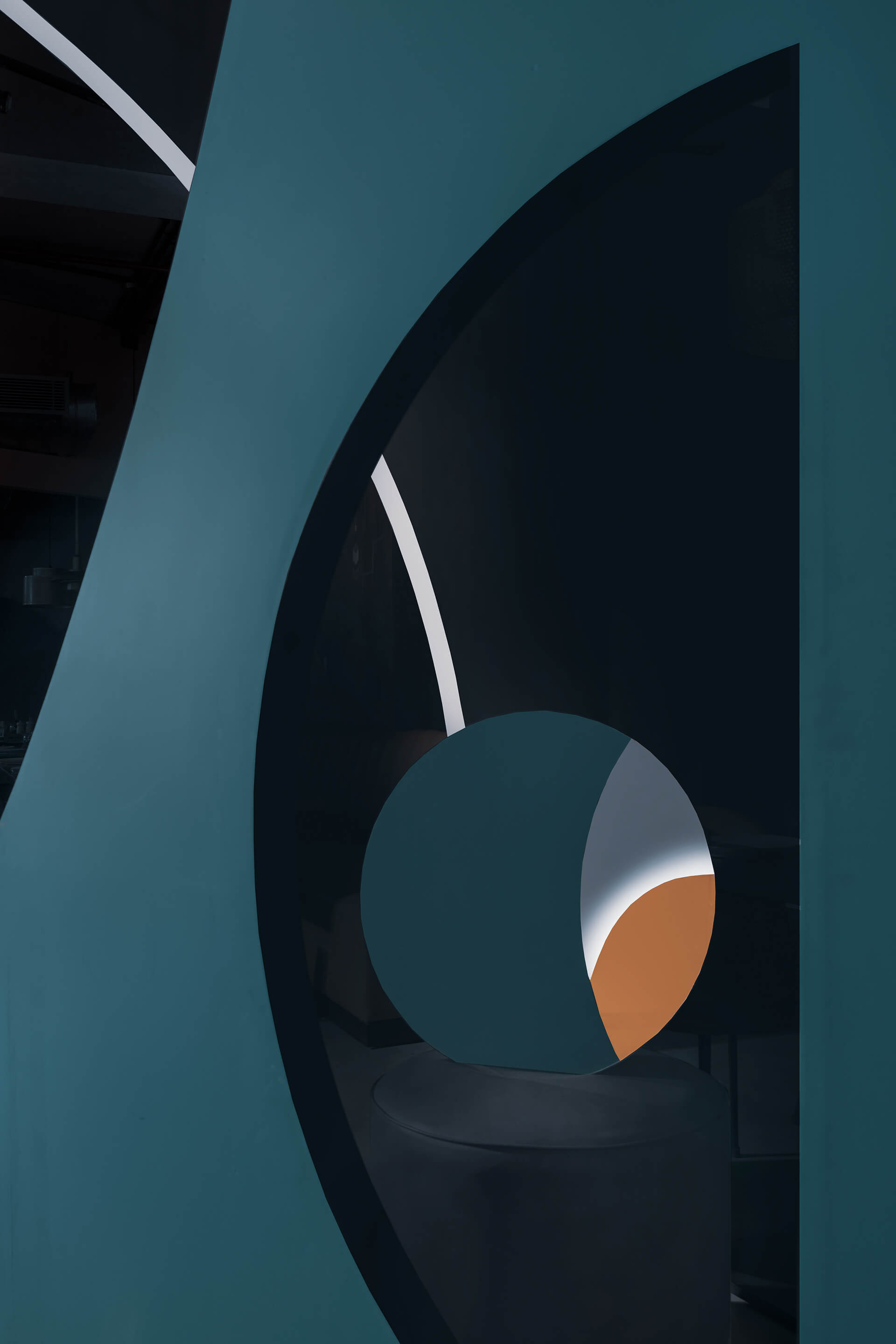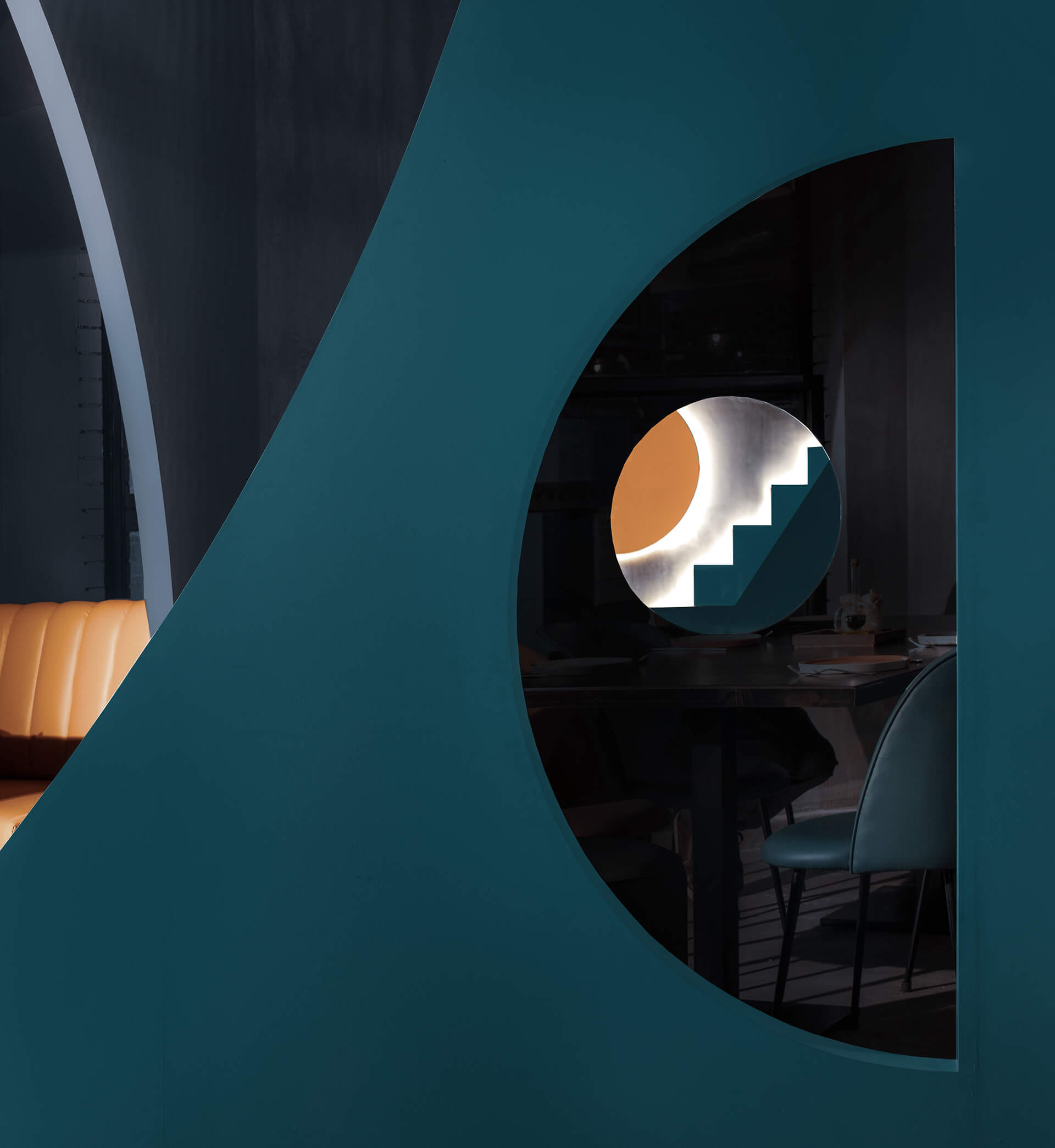 有些墙壁有半圆形的切口,从这望去,可以看到有着木框椅子和凳子的小角落,客人可以坐在那里玩游戏。带有阶梯状轮廓的凸起模板被应用到墙壁上,背光看起来更立体。