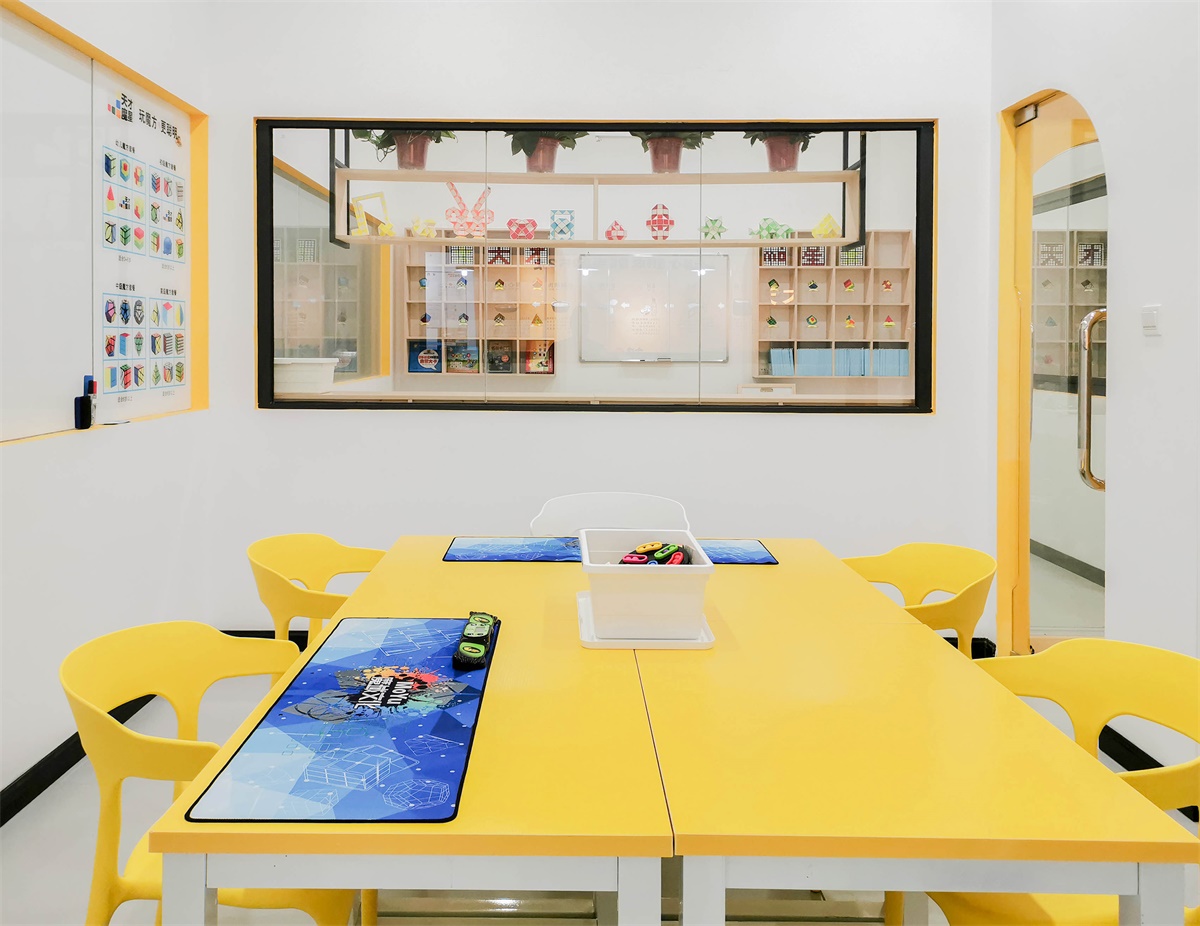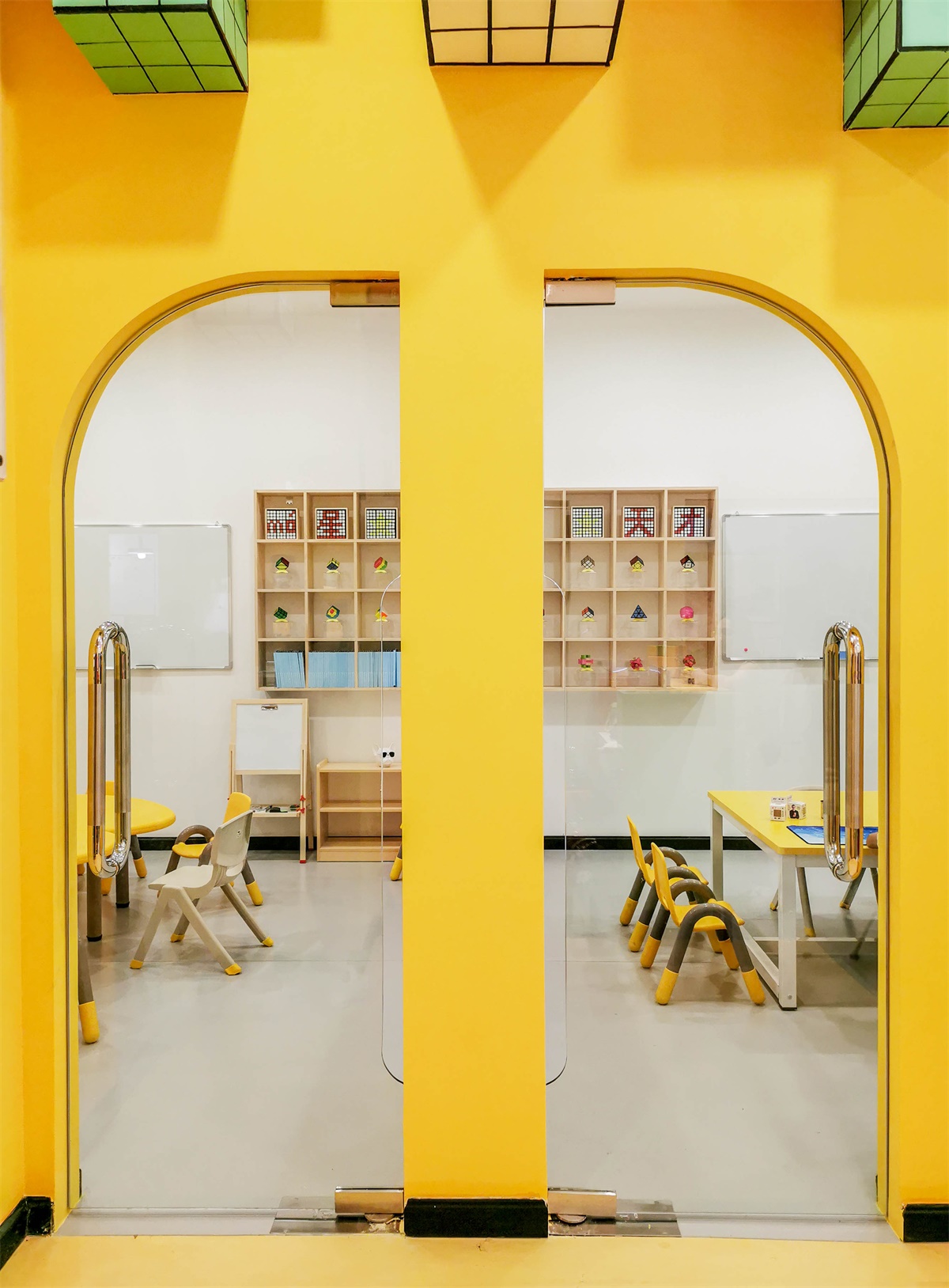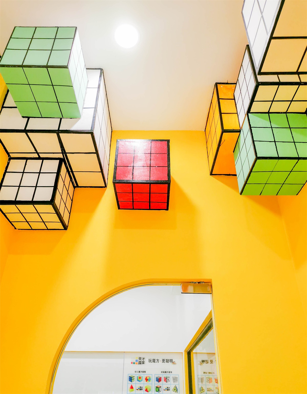 由接待厅进入到一个小中厅,再通往三个教室,中厅为中心,向心而生,在这里我们希望构建一个强视觉的体验,在墙面的设计上我们采用折叠式墙体,为打破常规的平面墙,并在天花处设计了12个大小不同的魔方盒子,以魔方艺术装置的形式创建空间中心焦点,真假魔方交互运用。魔方概念由外至里。在门的设计上,巧用了弧形玻璃门,玻璃门下端设计成凹弧形,防止小孩夹手。