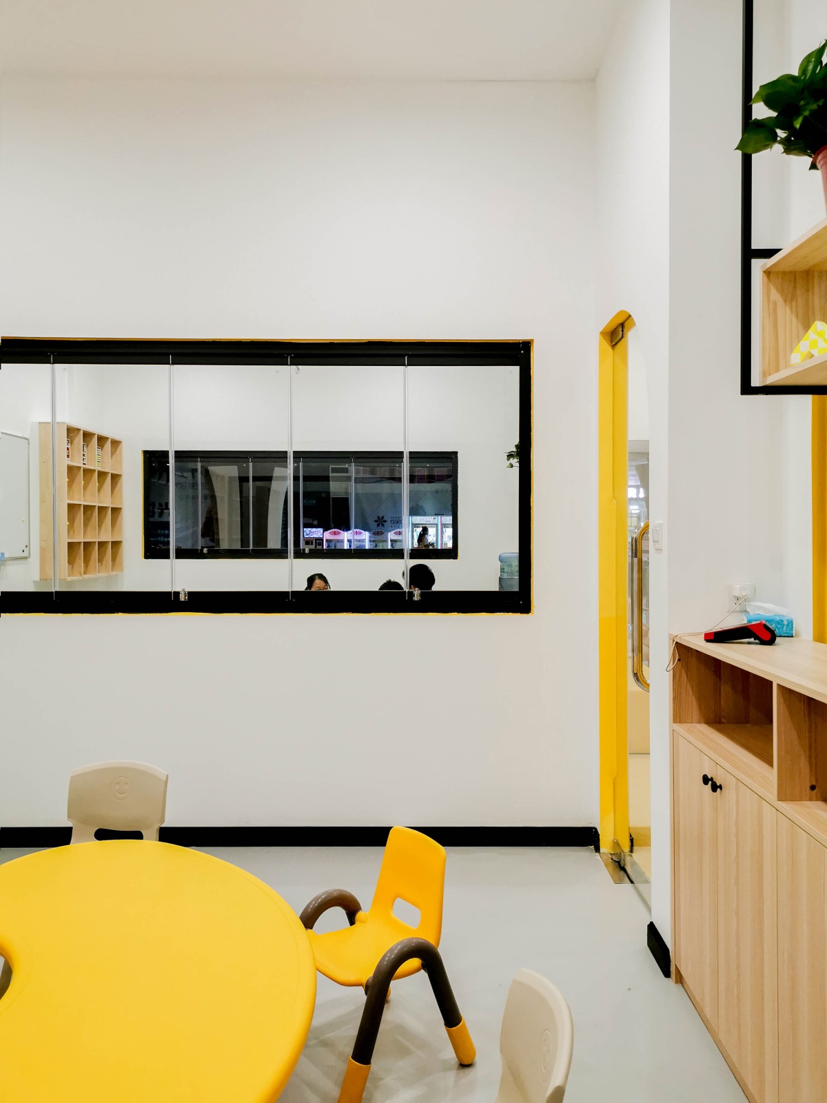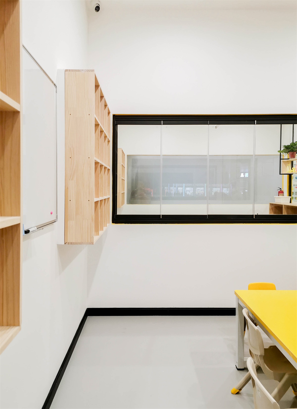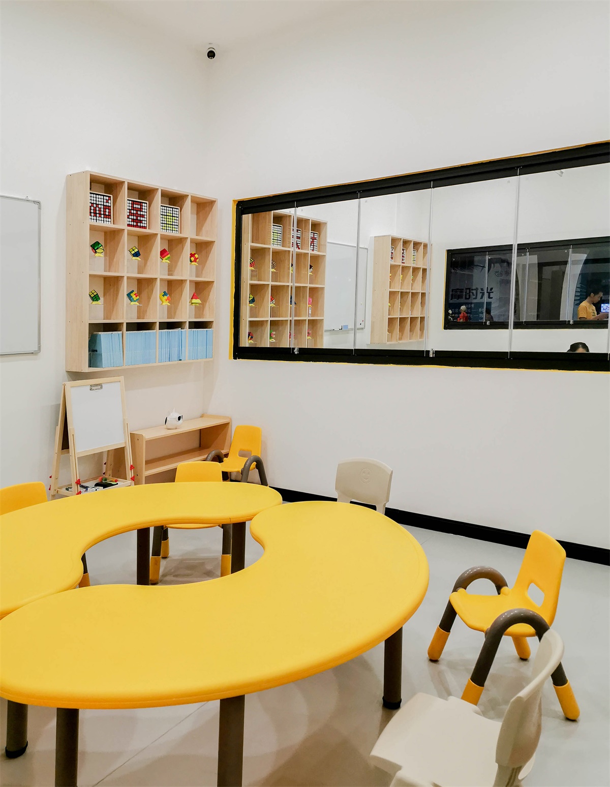 由接待厅进入到一个小中厅,再通往三个教室,中厅为中心,向心而生,在这里我们希望构建一个强视觉的体验,在墙面的设计上我们采用折叠式墙体,为打破常规的平面墙,并在天花处设计了12个大小不同的魔方盒子,以魔方艺术装置的形式创建空间中心焦点,真假魔方交互运用。魔方概念由外至里。在门的设计上,巧用了弧形玻璃门,玻璃门下端设计成凹弧形,防止小孩夹手。