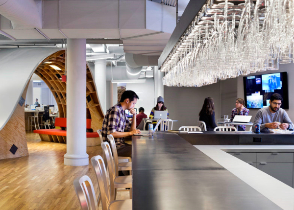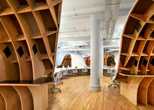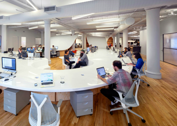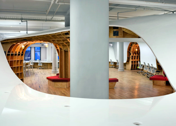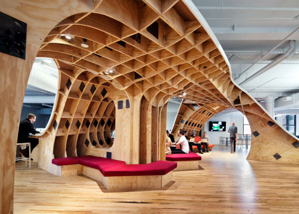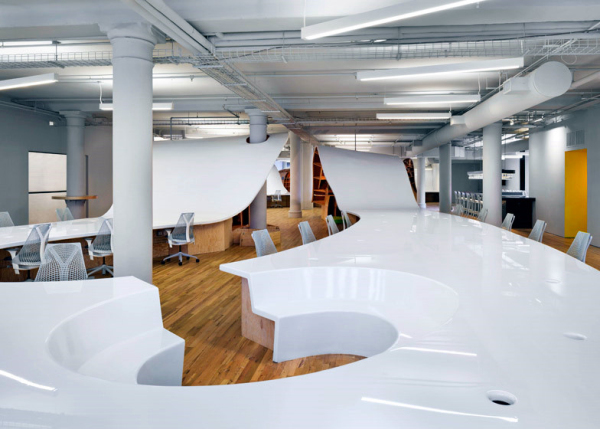 公司本部的办公室使用了800多片独特功能的胶板,外层是带有金属光泽的白色烤漆,再经由长达 30 小时的融和过程,製造出一个表面无缝的绵延桌体,另外,绵延的范围还延伸到了外围区域,搭配著如同鸡蛋盒般的弯曲形体,以屏蔽出会议室、休息室或是储存区的空间。或许就像 The Barbarian Group 提及的企业精神之一,希望员工们能把客户和公司之间做个巧妙的连结,除了凝聚员工彼此之间向心力之外,或许也让客户感受到一个社区体的概念,增加其连结动力。